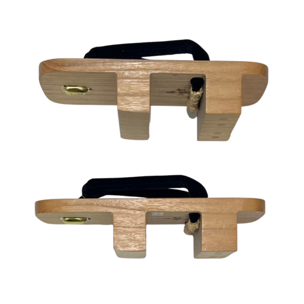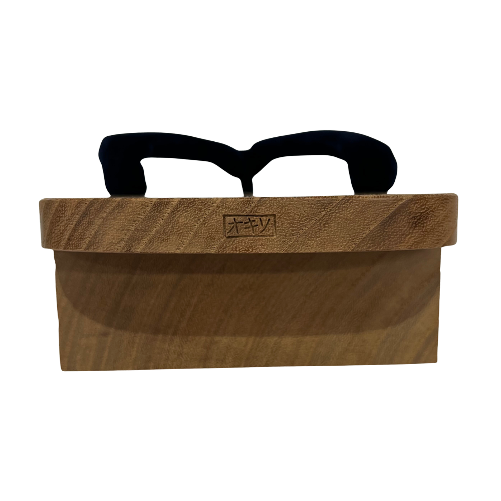 美しい木目の高級桐を使用した台に、しっとりとした手触りと深みのある光沢が特徴の「黒ビロード」の鼻緒を挿した、極めてオーソドックスかつ贅沢な一足です。