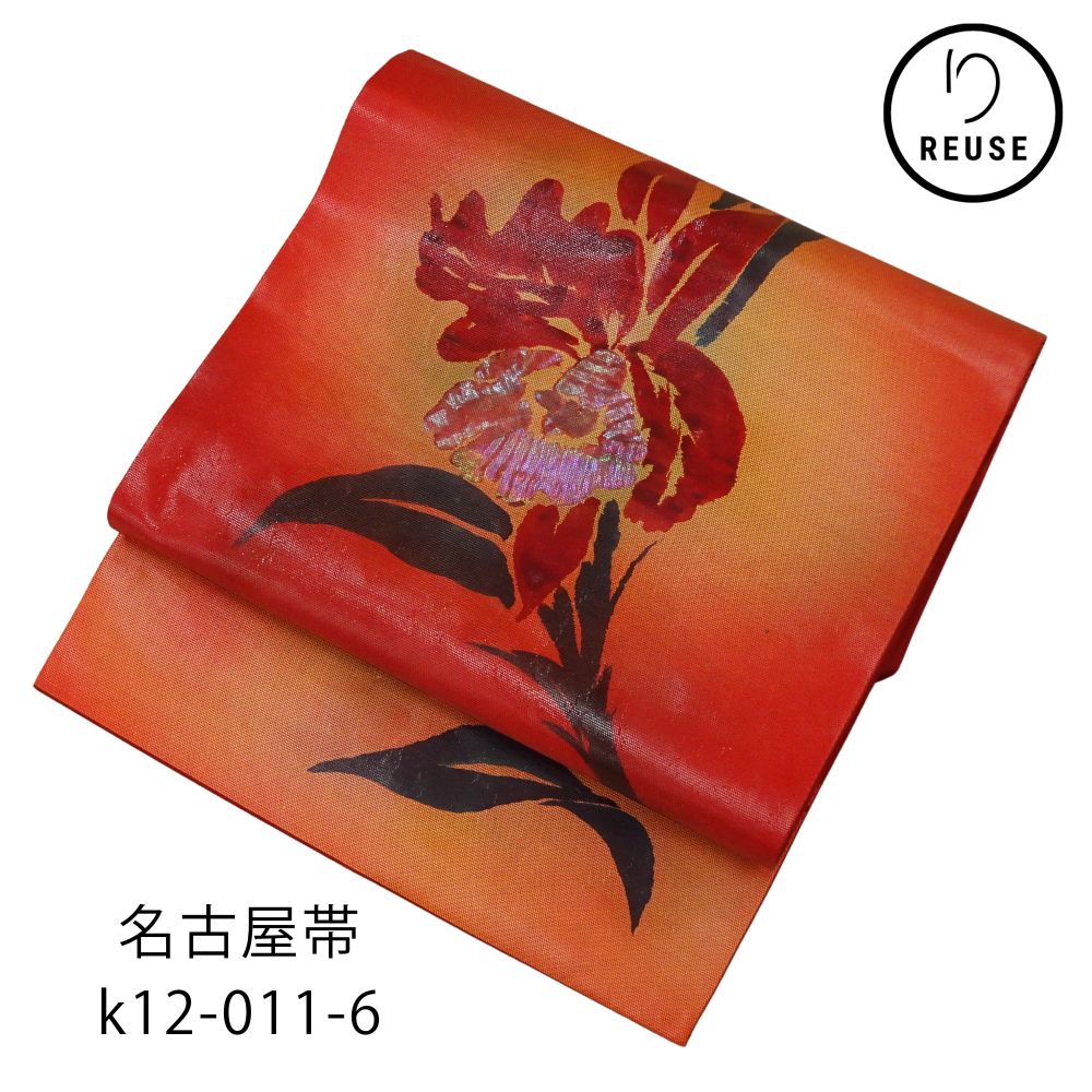 名古屋帯 正絹 リユース 中古 朱色〜オレンジ グラデーション カトレア k012-011-6 カジュアル〜セミフォーマル