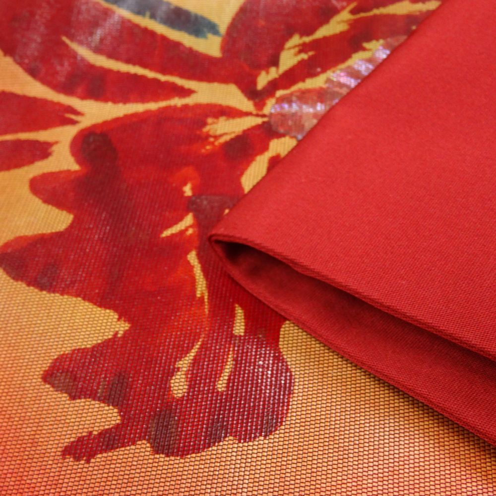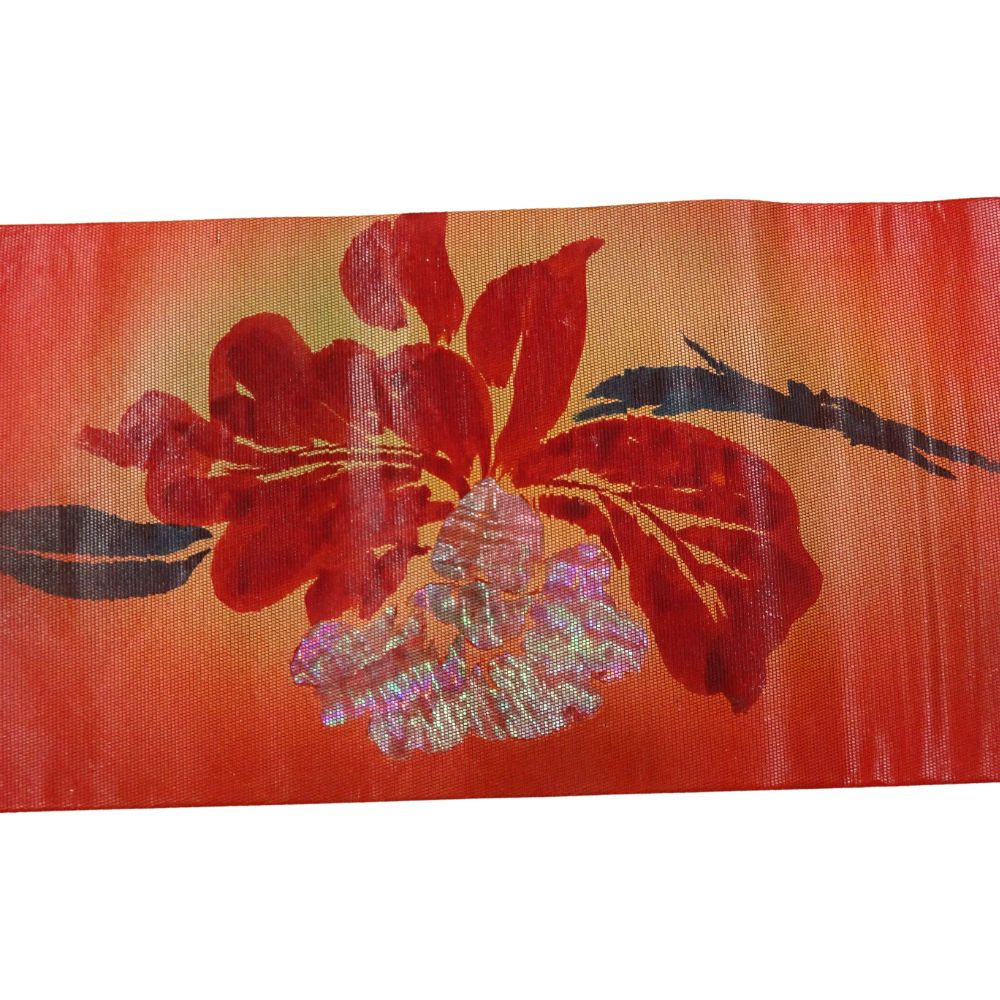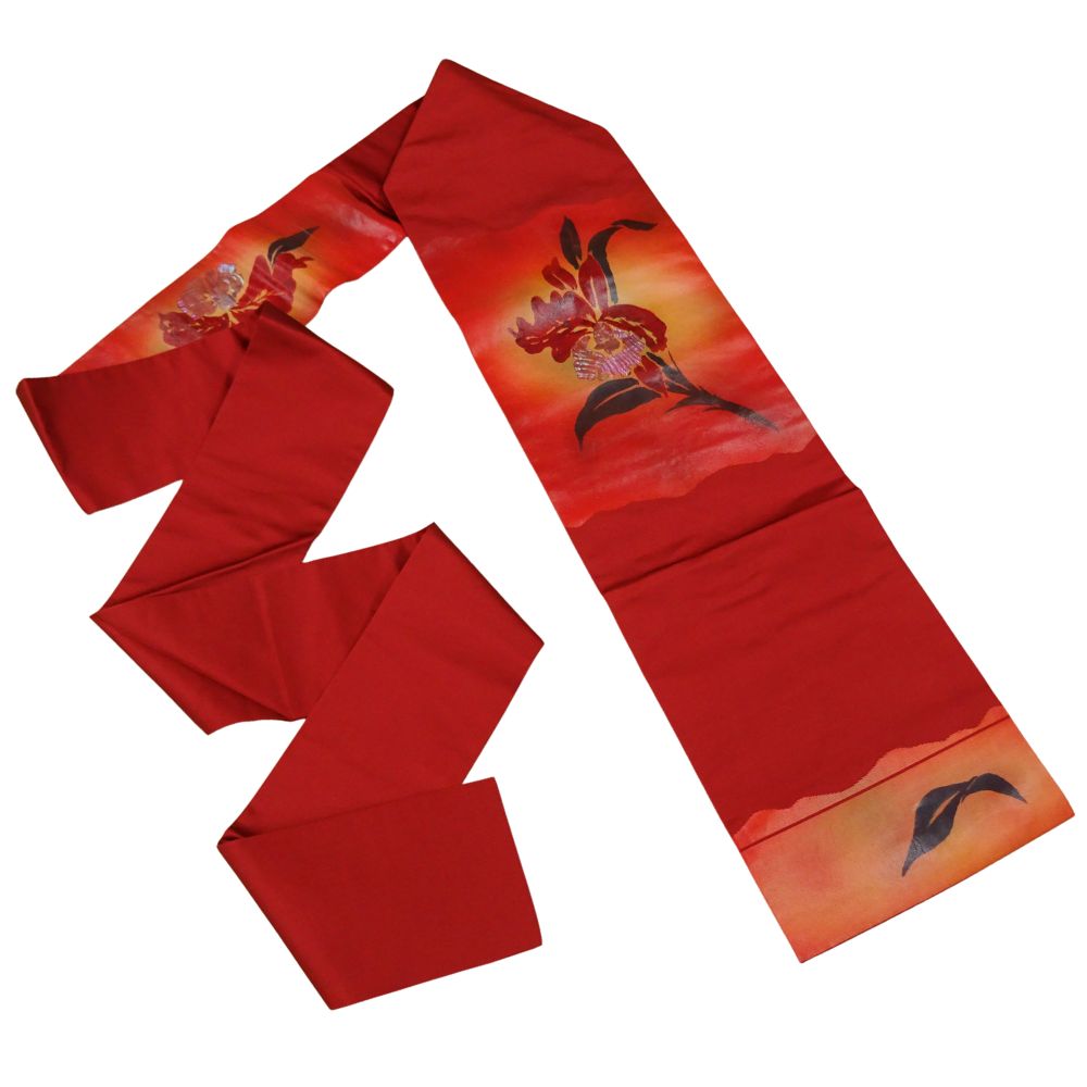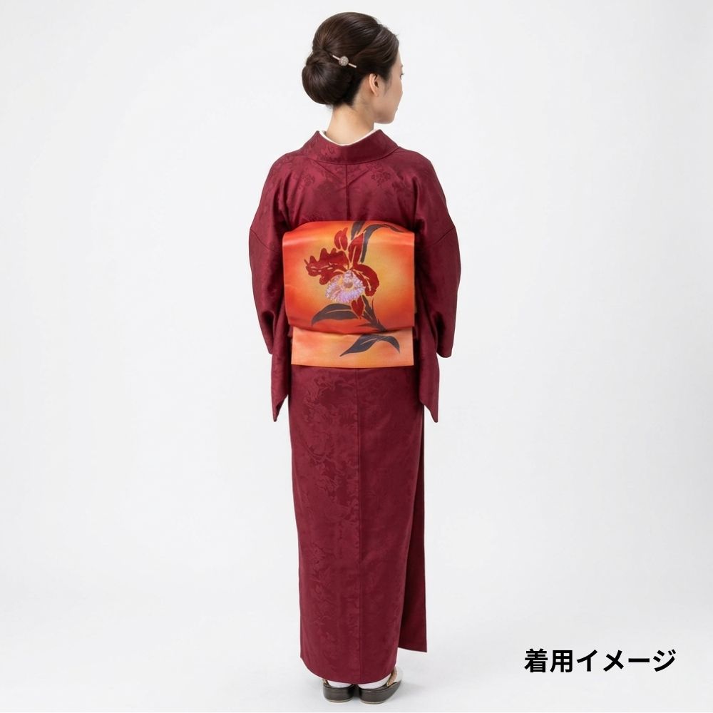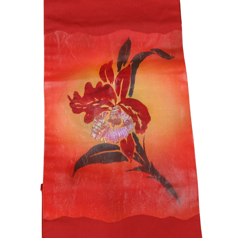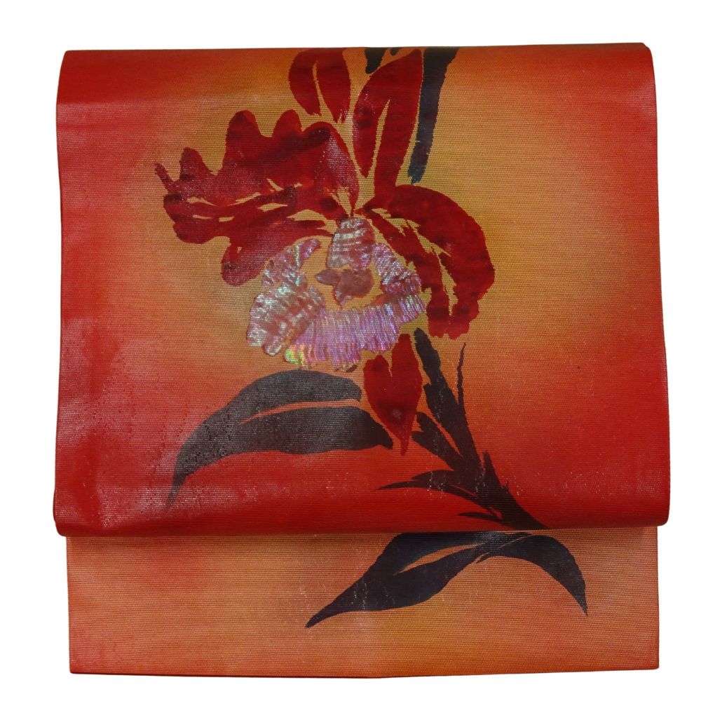 深みのある朱色〜オレンジへのグラデーションの地に、大胆に描かれた大輪のカトレアが非常に美しい、現代的な感覚の名古屋帯です。