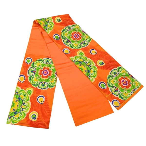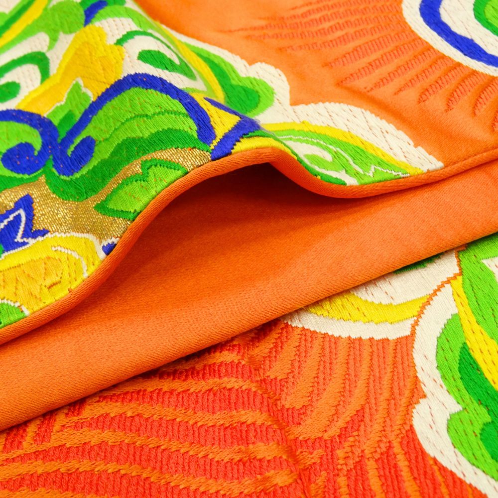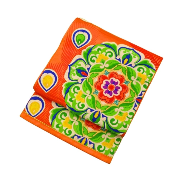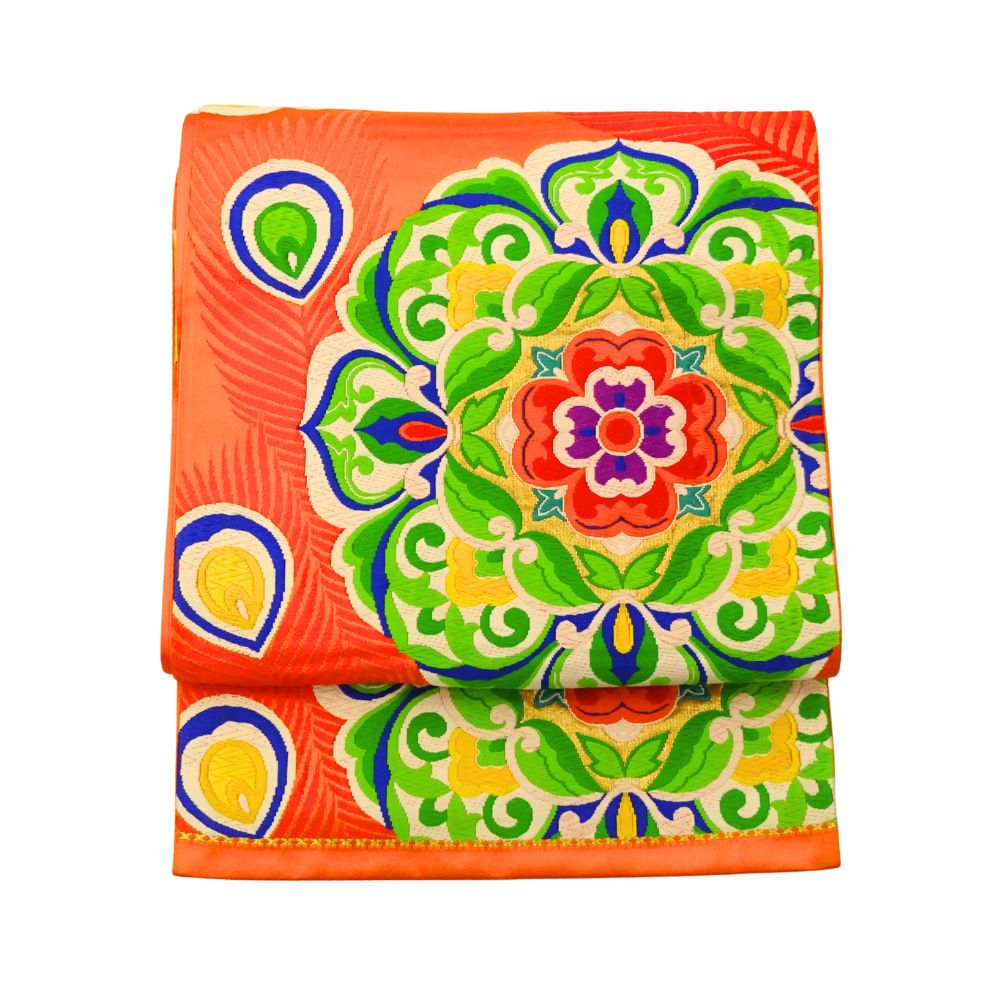 袋帯 振袖用 正絹 リユース 中古 孔雀 羽根 華文 朱色 オレンジ系 K10-002-1(8050-00556)