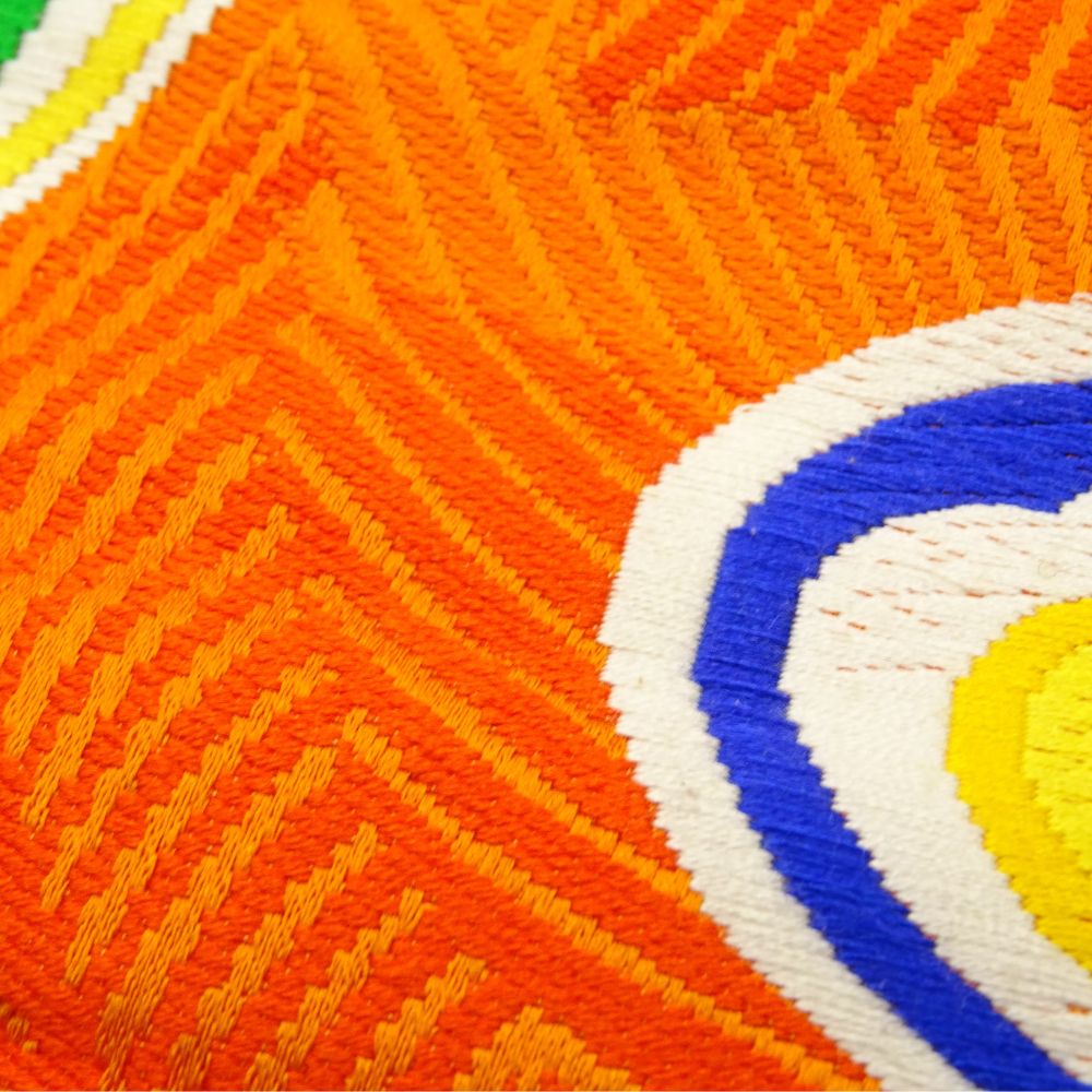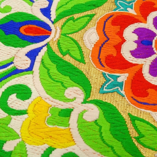 鮮やかなグリーンやイエロー、パープルの色使いが、まるで刺繍のような立体感で織り上げられており、非常に豪華でモダンな印象を与えます。