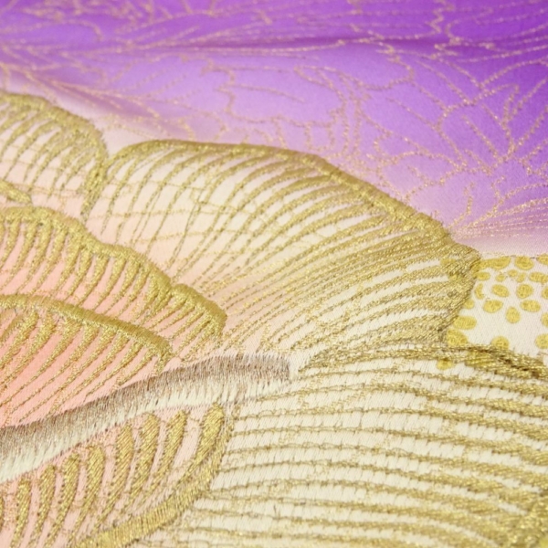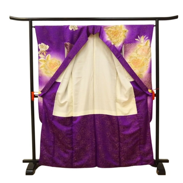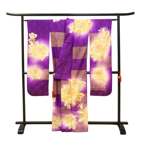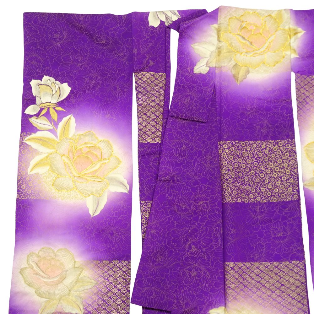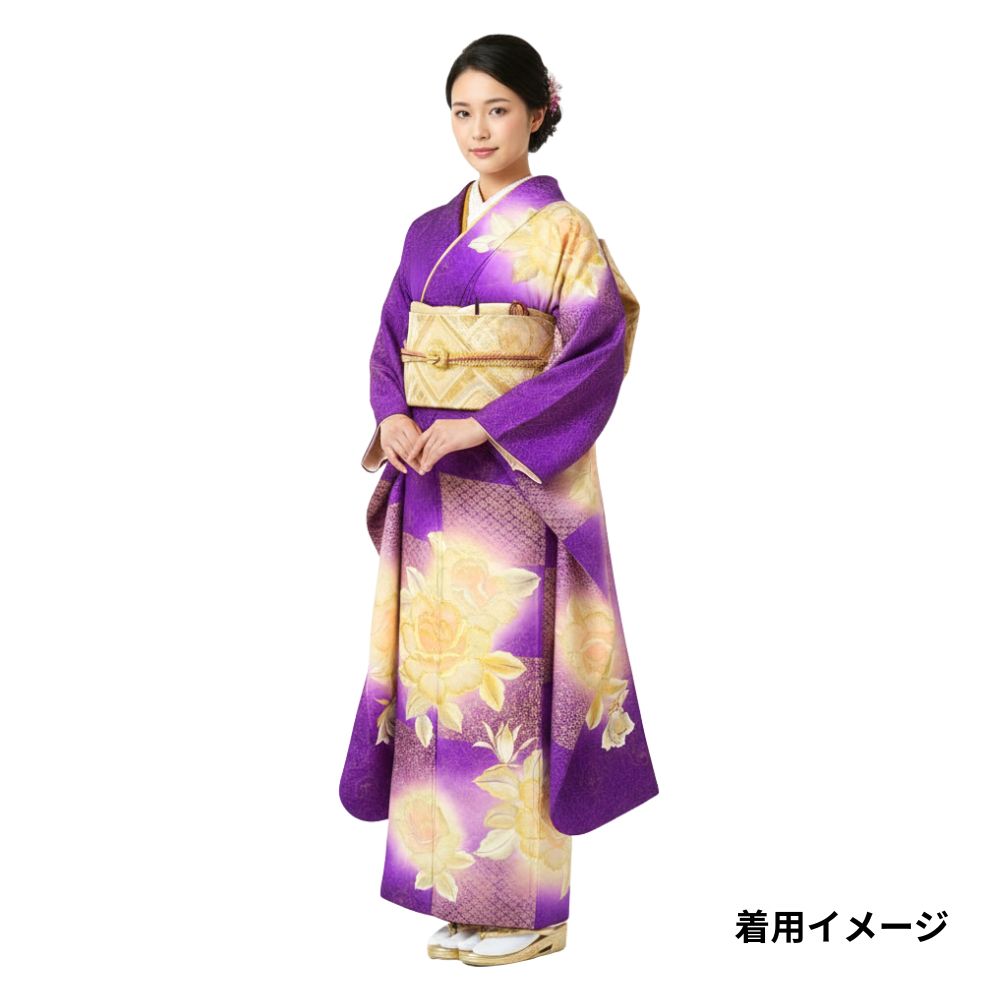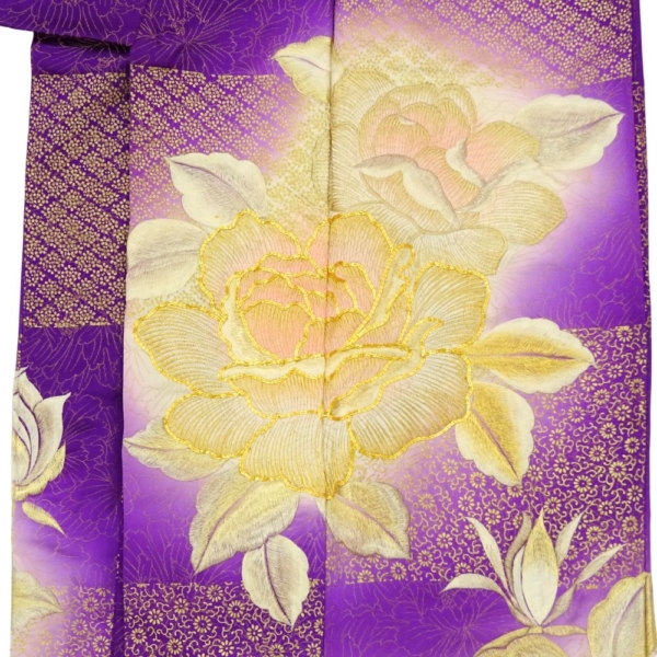 奥行きのある紫のグラデーションに、浮かび上がるような大輪の薔薇が描かれており、成人式やパーティーなど、主役として輝く場面にぴったりの一着です。