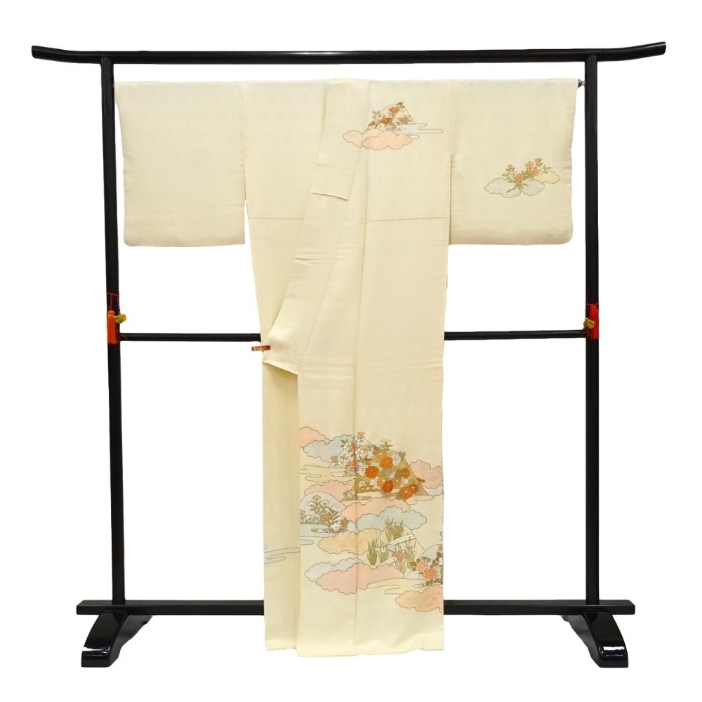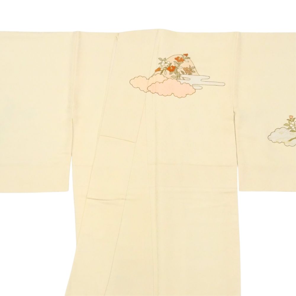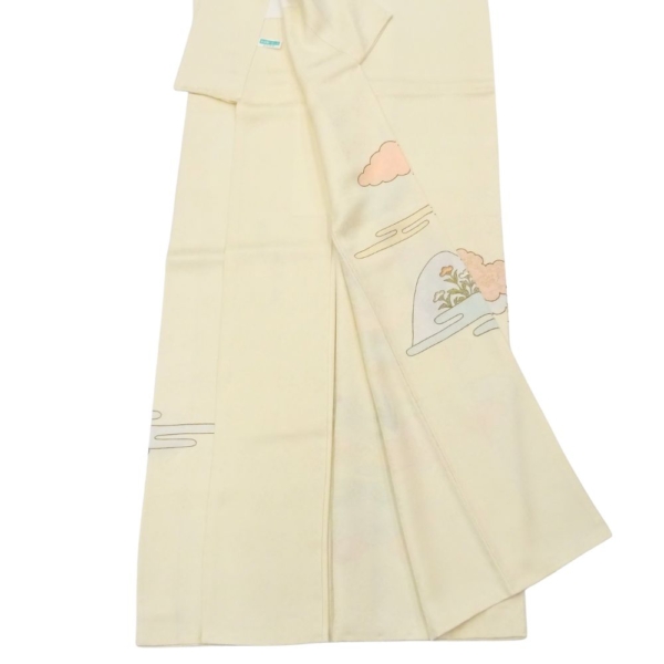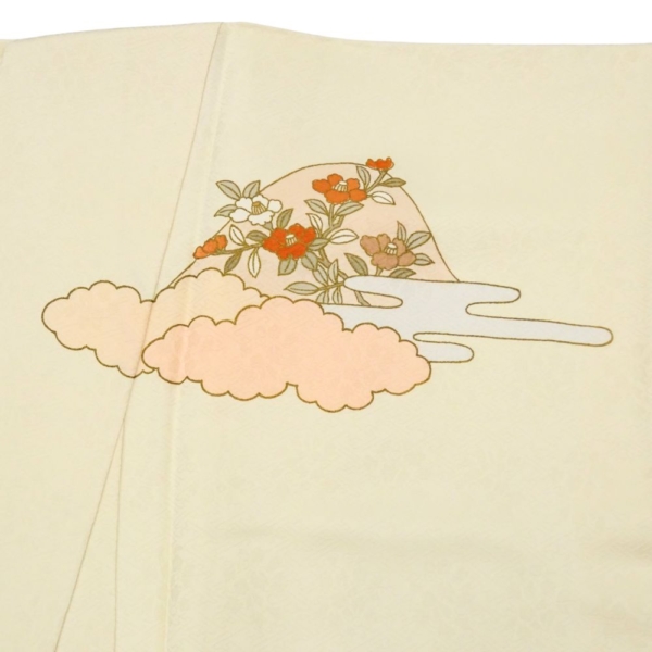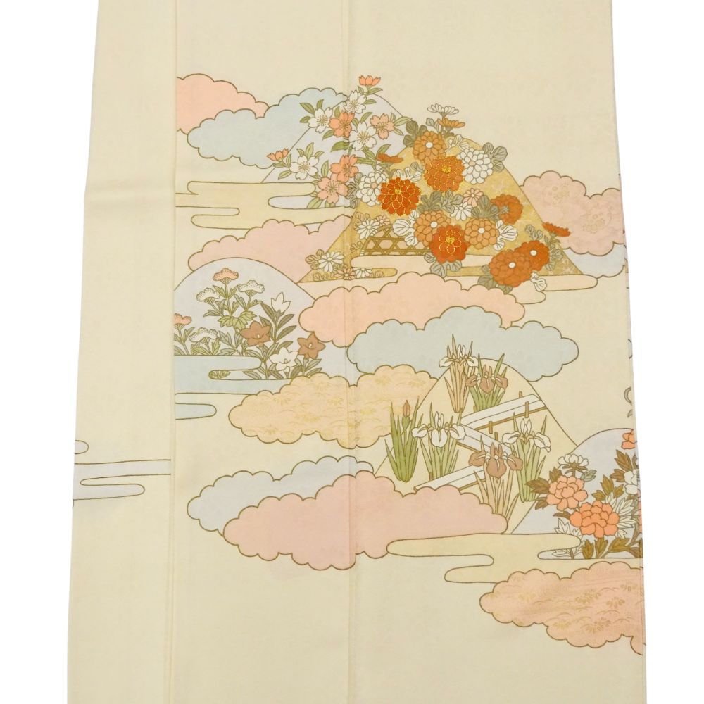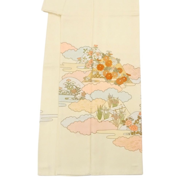 上品で優雅な淡いクリーム色の地色に、雲取りを背景として四季折々の花々(菊、菖蒲、山吹など)が京友禅の豊かな色彩で描かれています。全体に吉祥文様である、紗綾型に花の地紋が織り出されており、光の加減で美しく浮かび上がります。