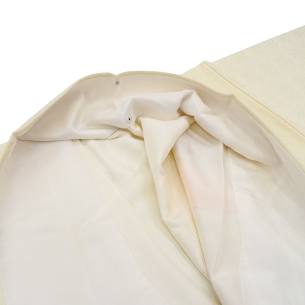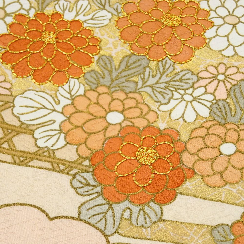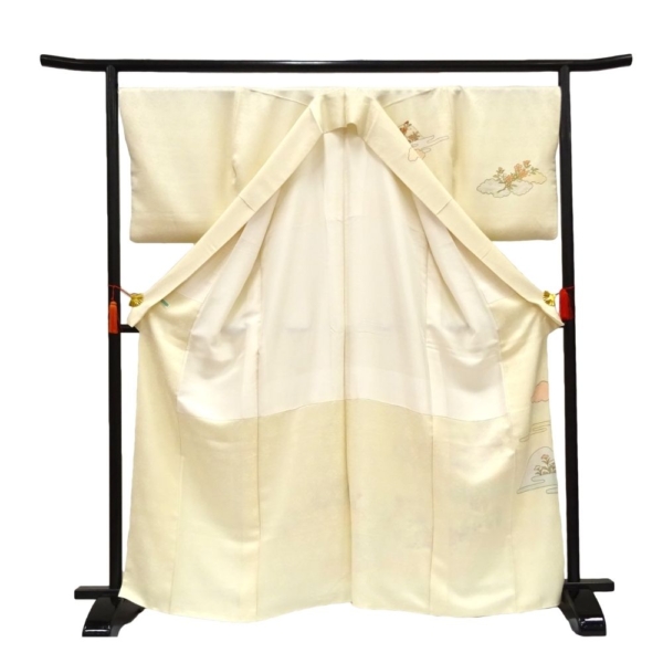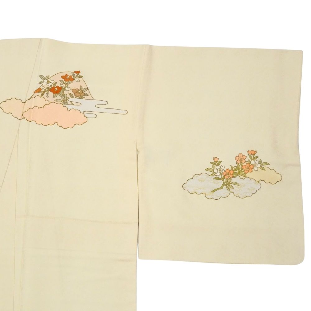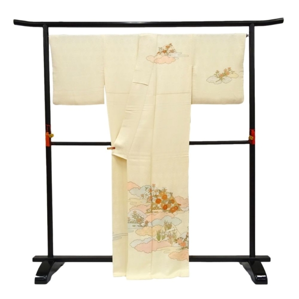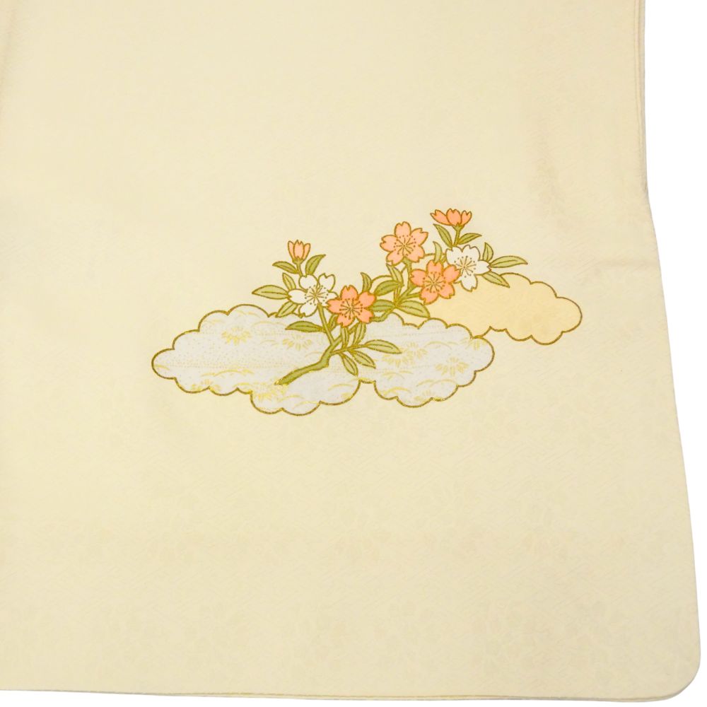 上品で優雅な淡いクリーム色の地色に、雲取りを背景として四季折々の花々(菊、菖蒲、山吹など)が京友禅の豊かな色彩で描かれています。全体に吉祥文様である、紗綾型に花の地紋が織り出されており、光の加減で美しく浮かび上がります。