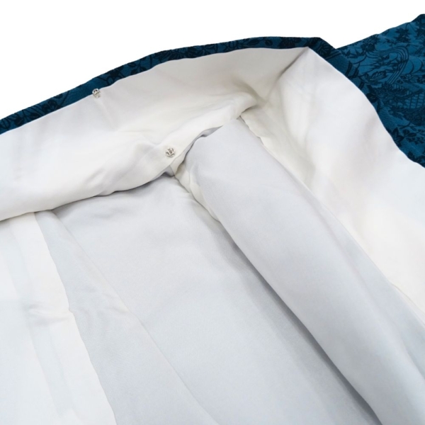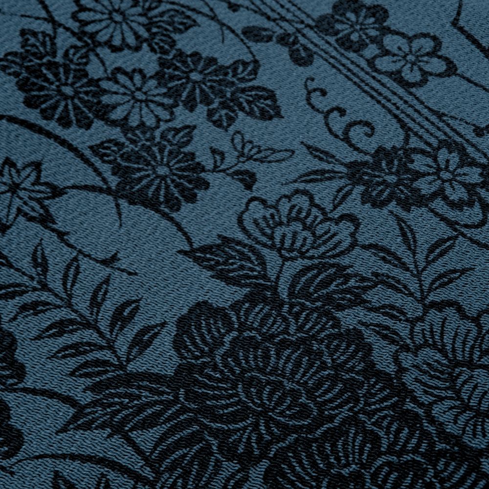 伝統的な流水(波)の文様を背景に、松、菊、梅などの四季の古典花が、密に、そして優雅に描かれています。