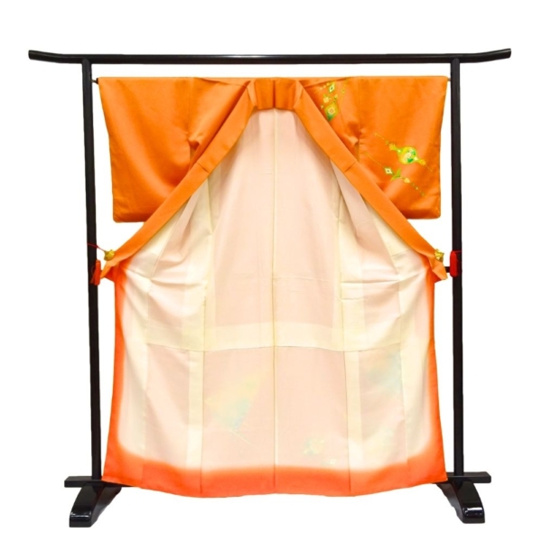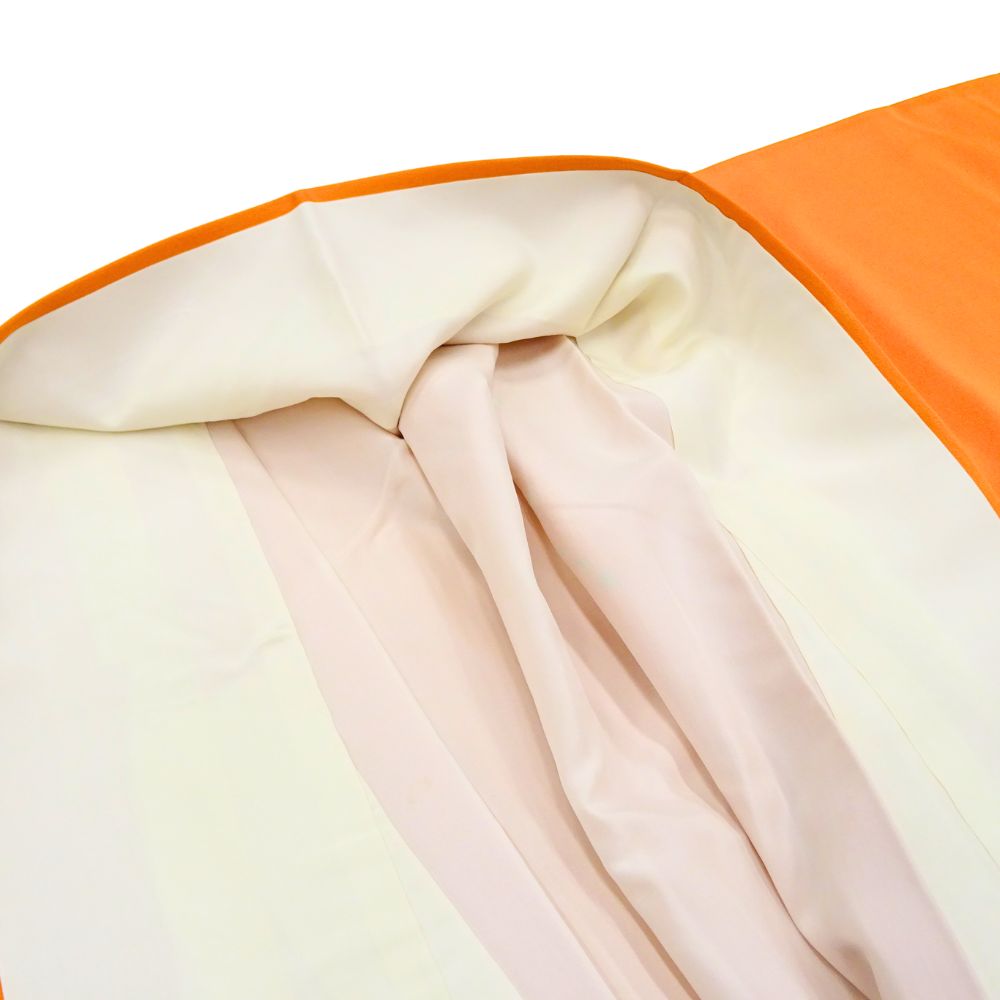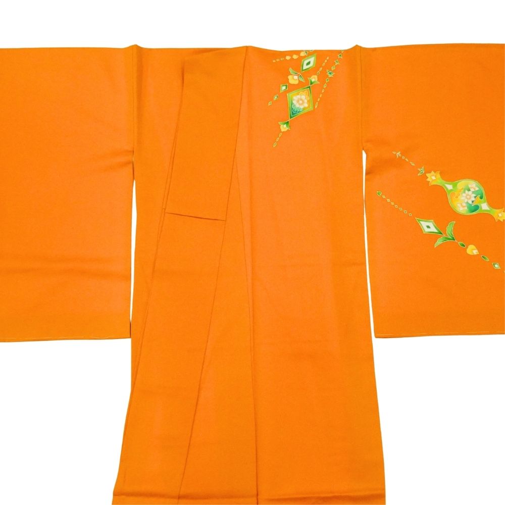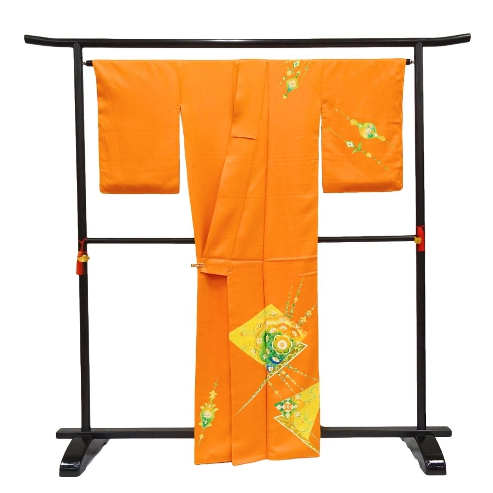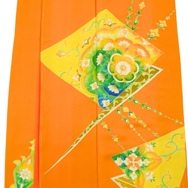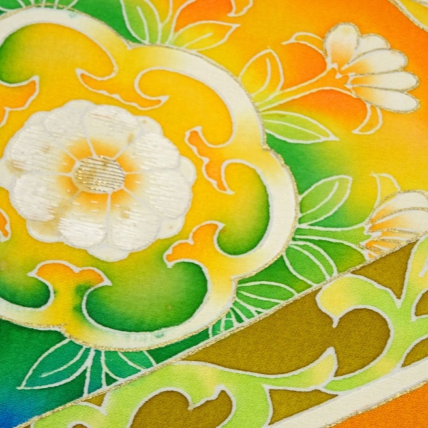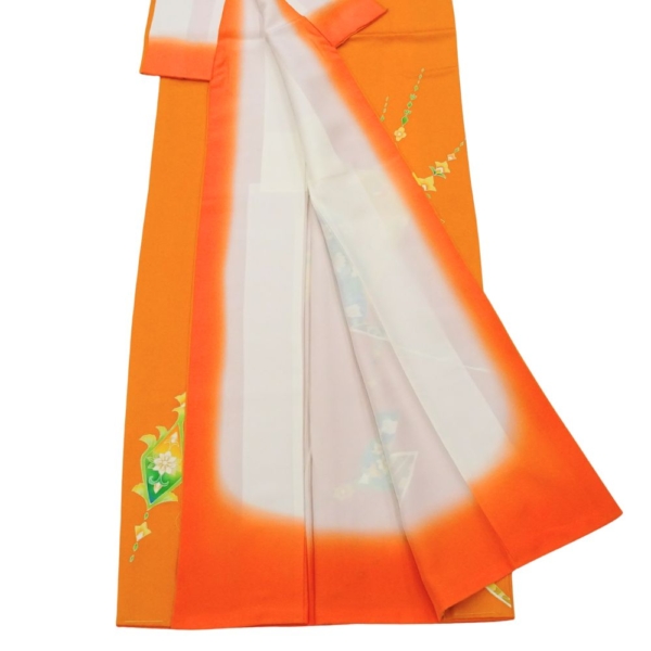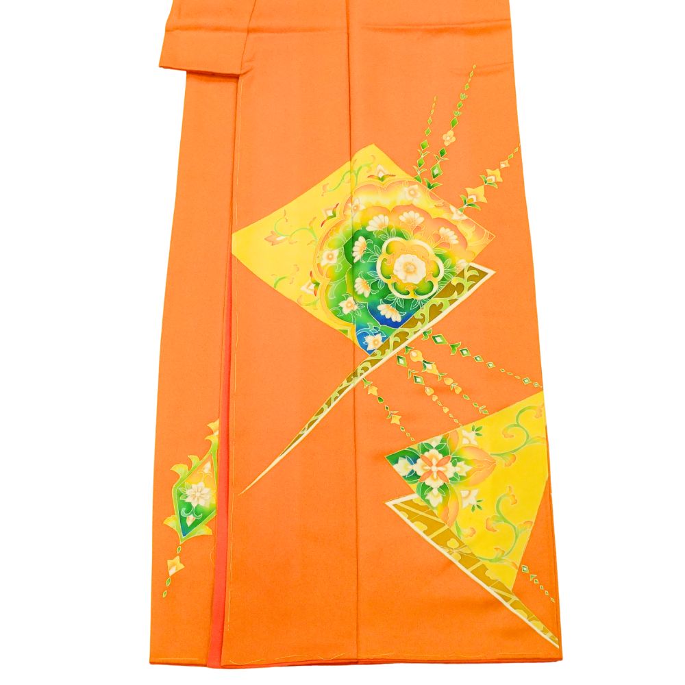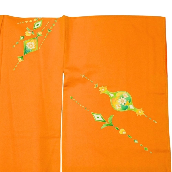 非常に鮮やかで明るいオレンジ色の地色に、友禅染めで描かれた大胆な文様が、モダンで都会的な印象を与えます。