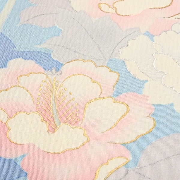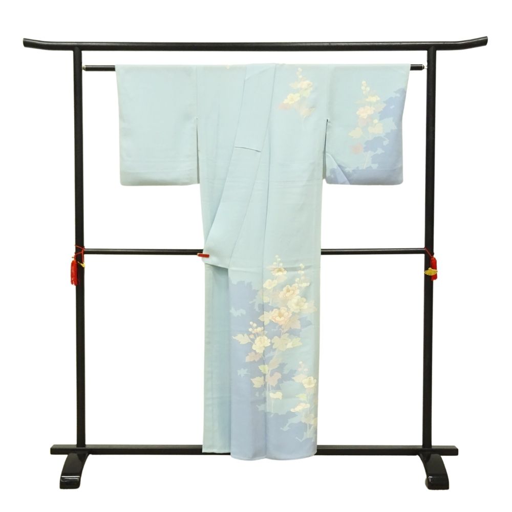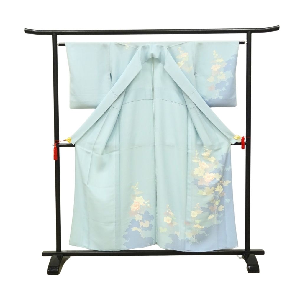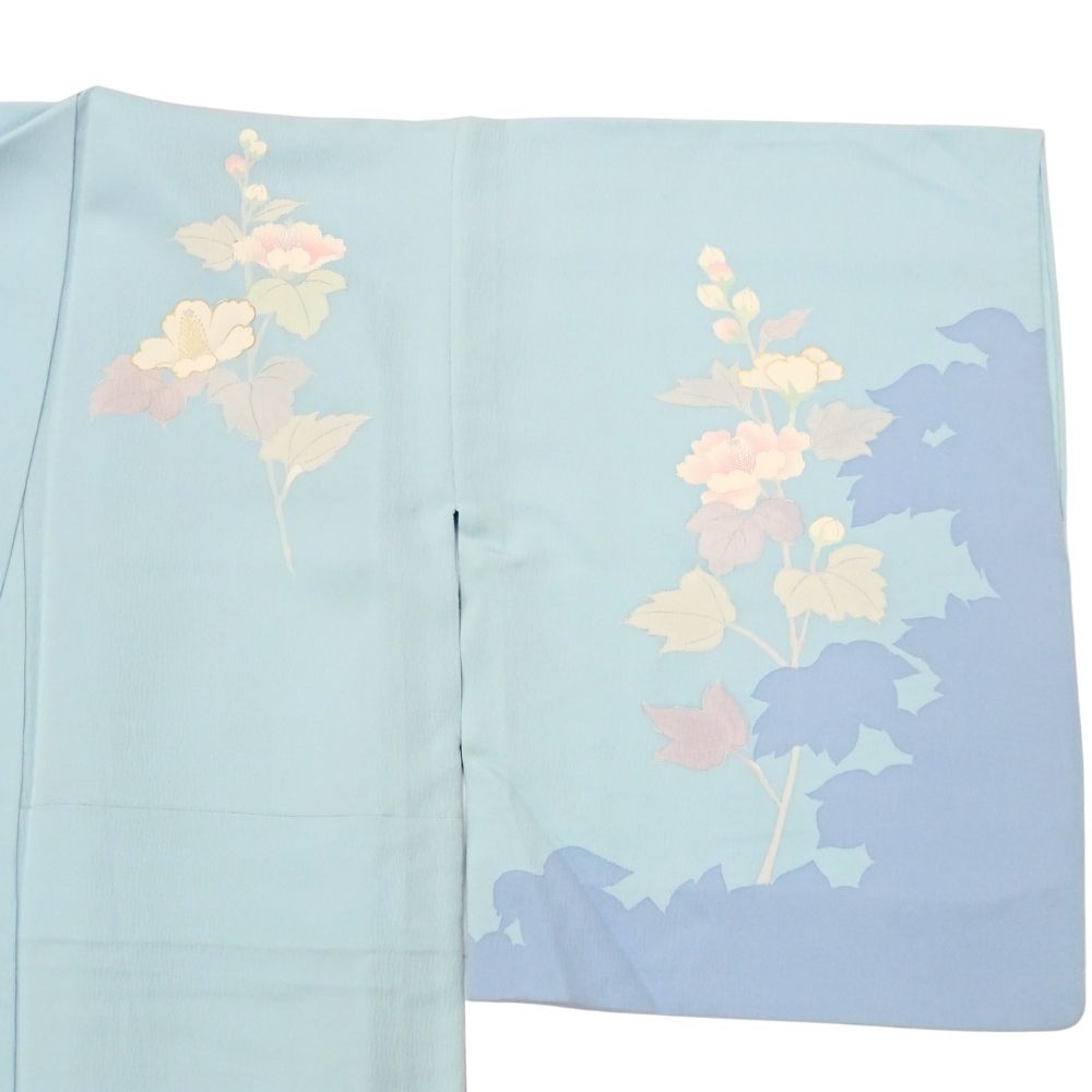 透き通るような明るい水色の地に、優美に咲き誇る芙蓉の花が描かれた単衣の附下です。
