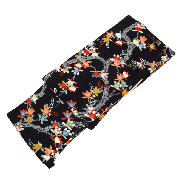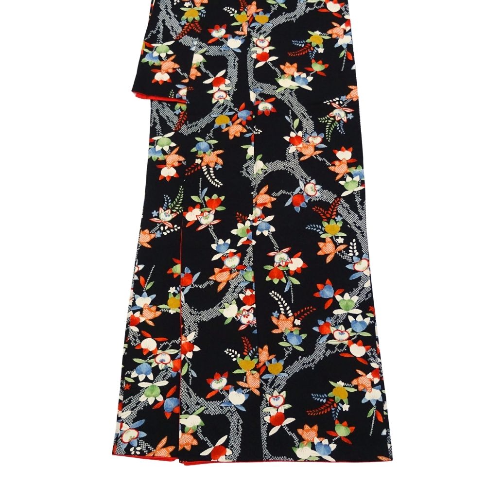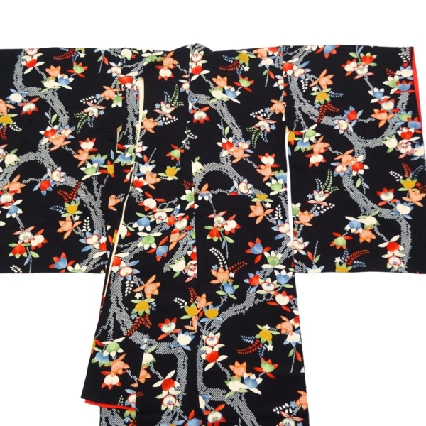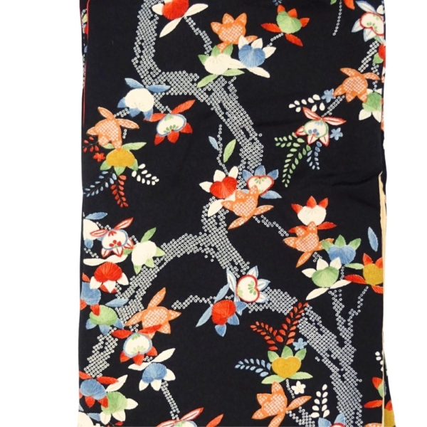 シックな黒地の地色に、多色使いの華やかな花柄がびっしりと染められた小紋です。