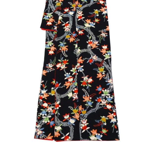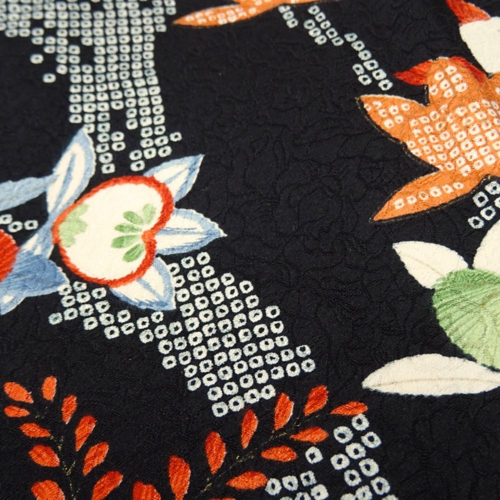 地色が黒のため柄のカラフルさが一層際立ち、大正ロマンや昭和レトロを感じさせるモダンで個性的な雰囲気を醸し出しています。