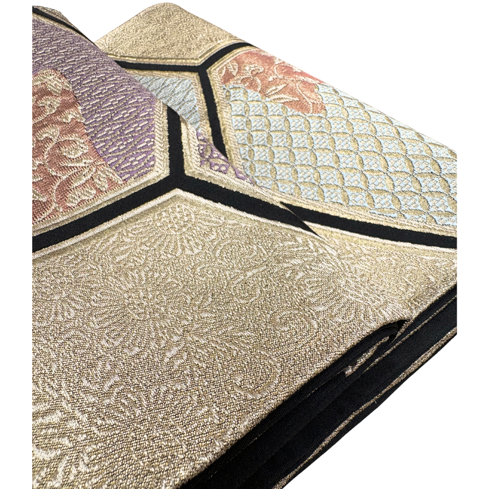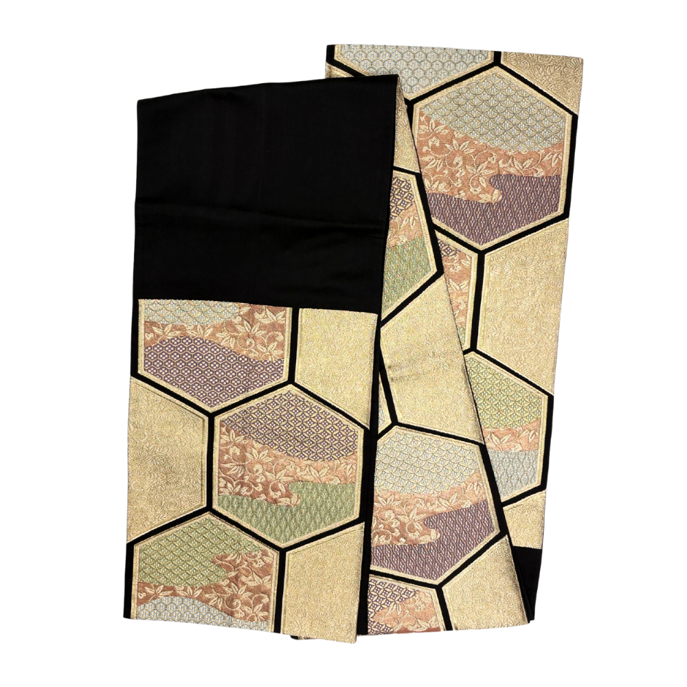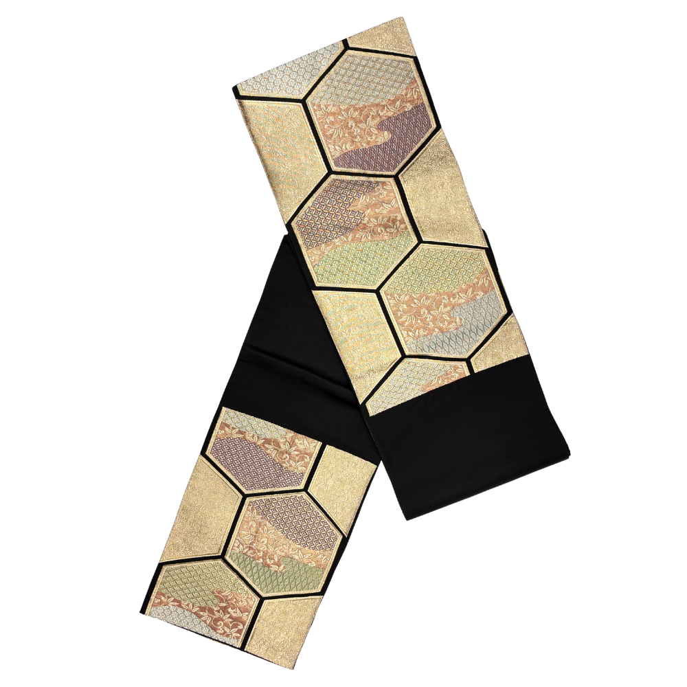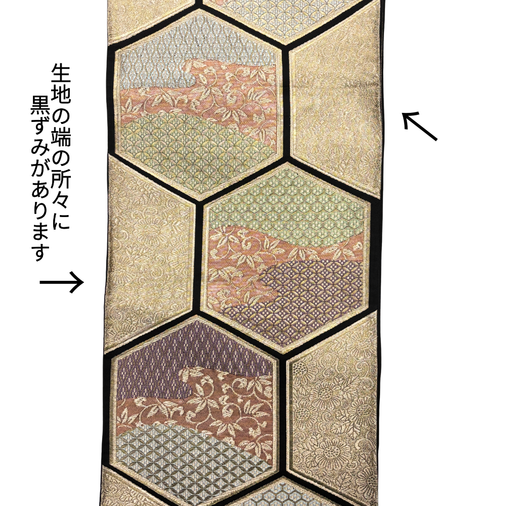 袋帯 六通柄 正絹 リユース 中古 亀甲繋ぎ 華紋 黒地 k10-008-1 (8050-00632)