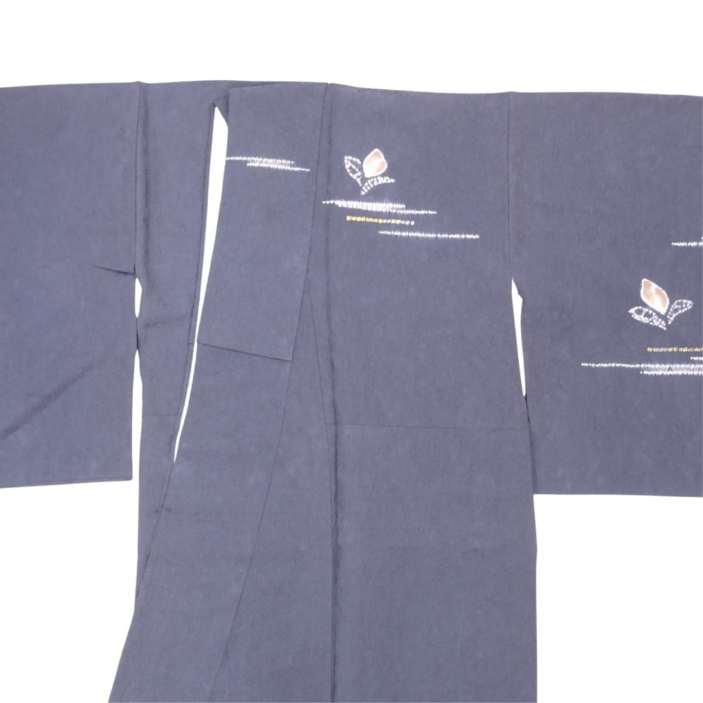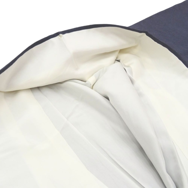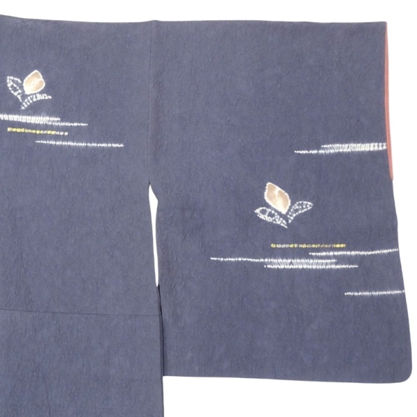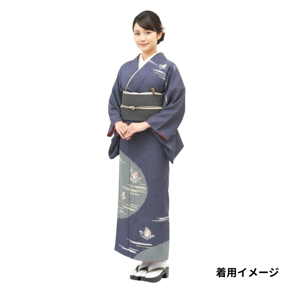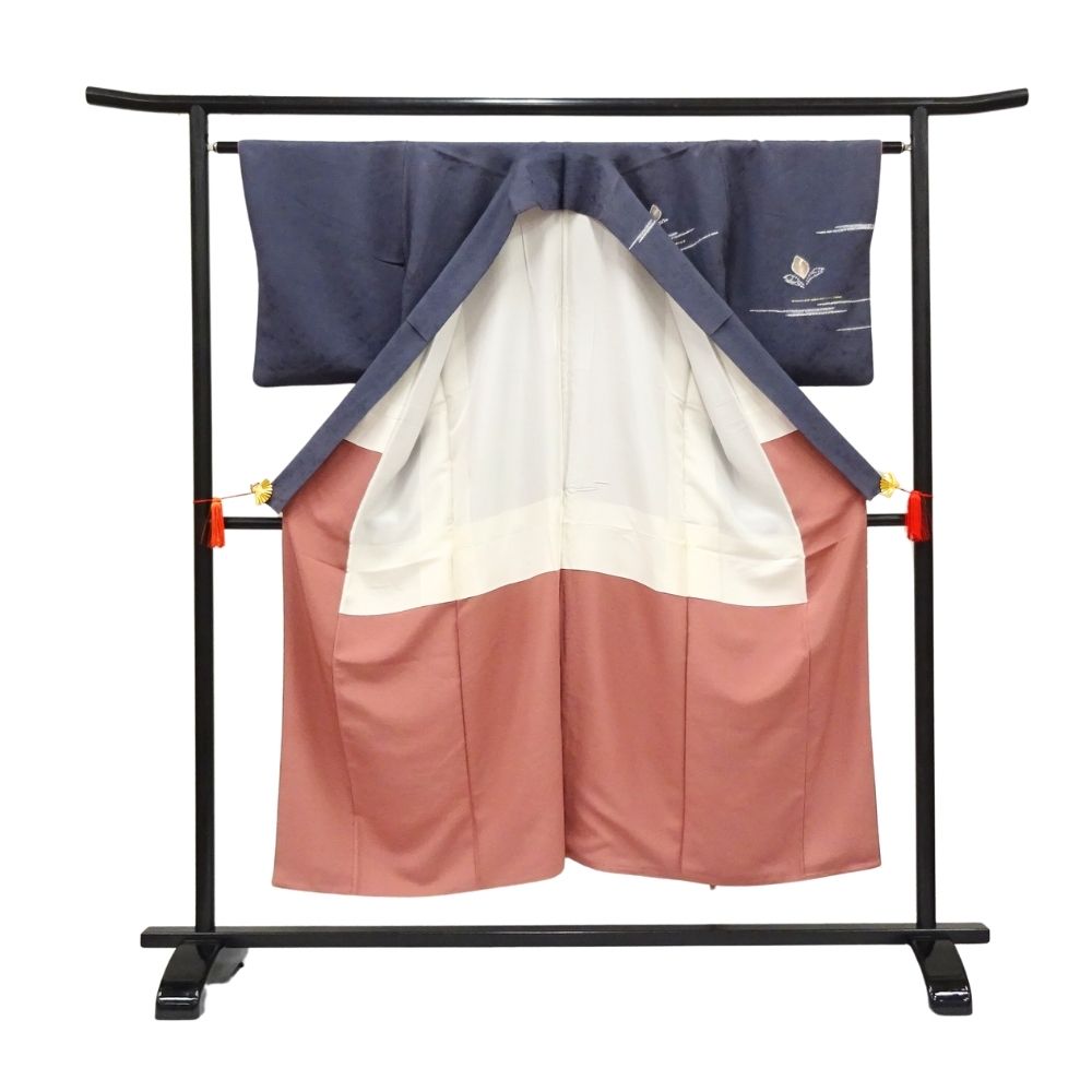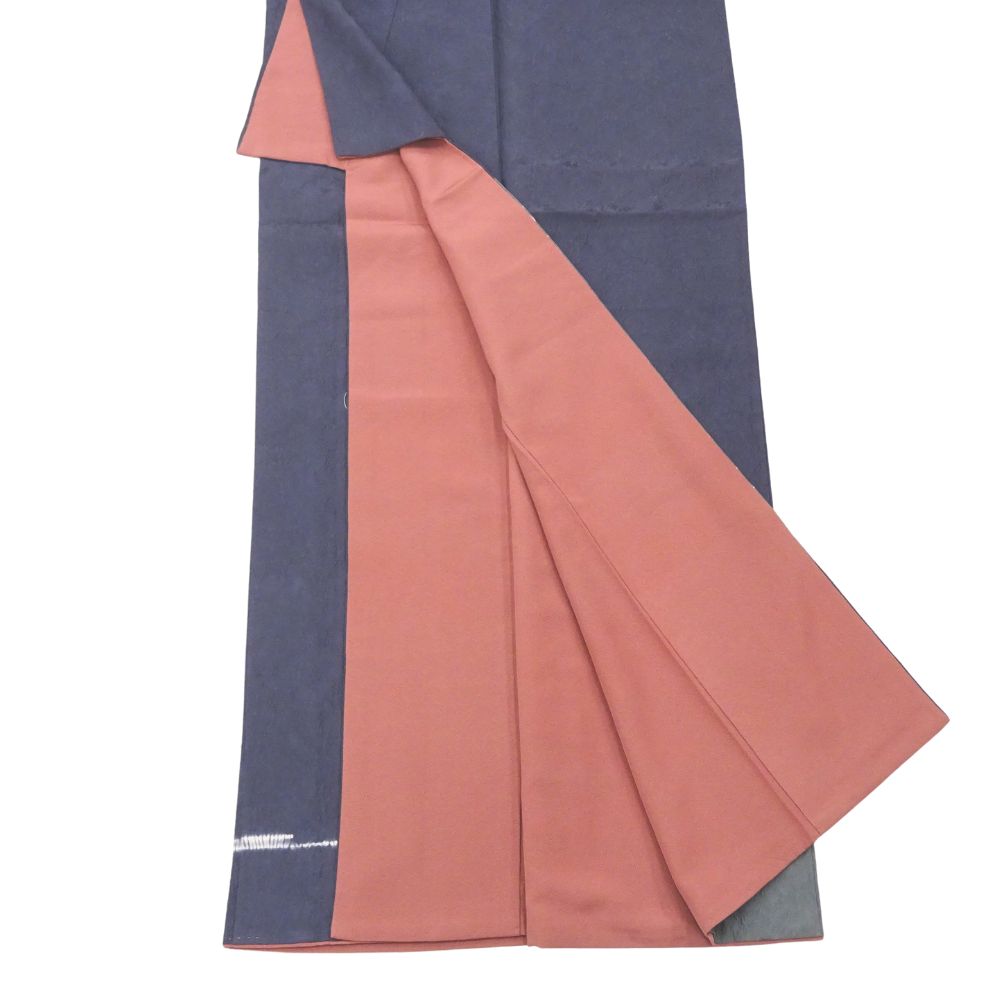 歩くたびにチラリと覗く八掛には、落ち着いたサーモンピンク系の色味が使われており、表地のシックな紺色とのコントラストが女性らしさを引き立てます。