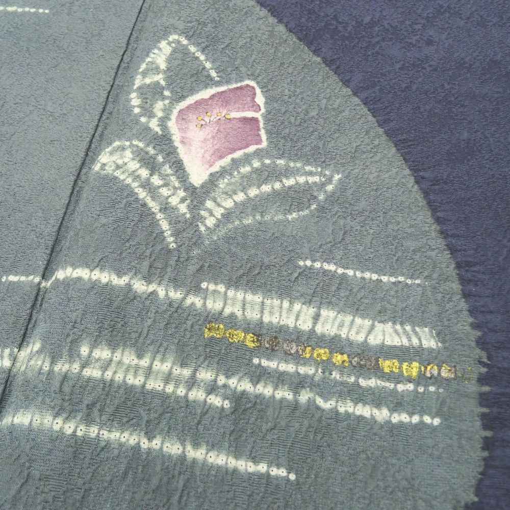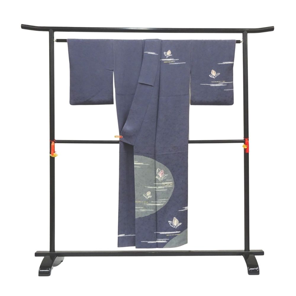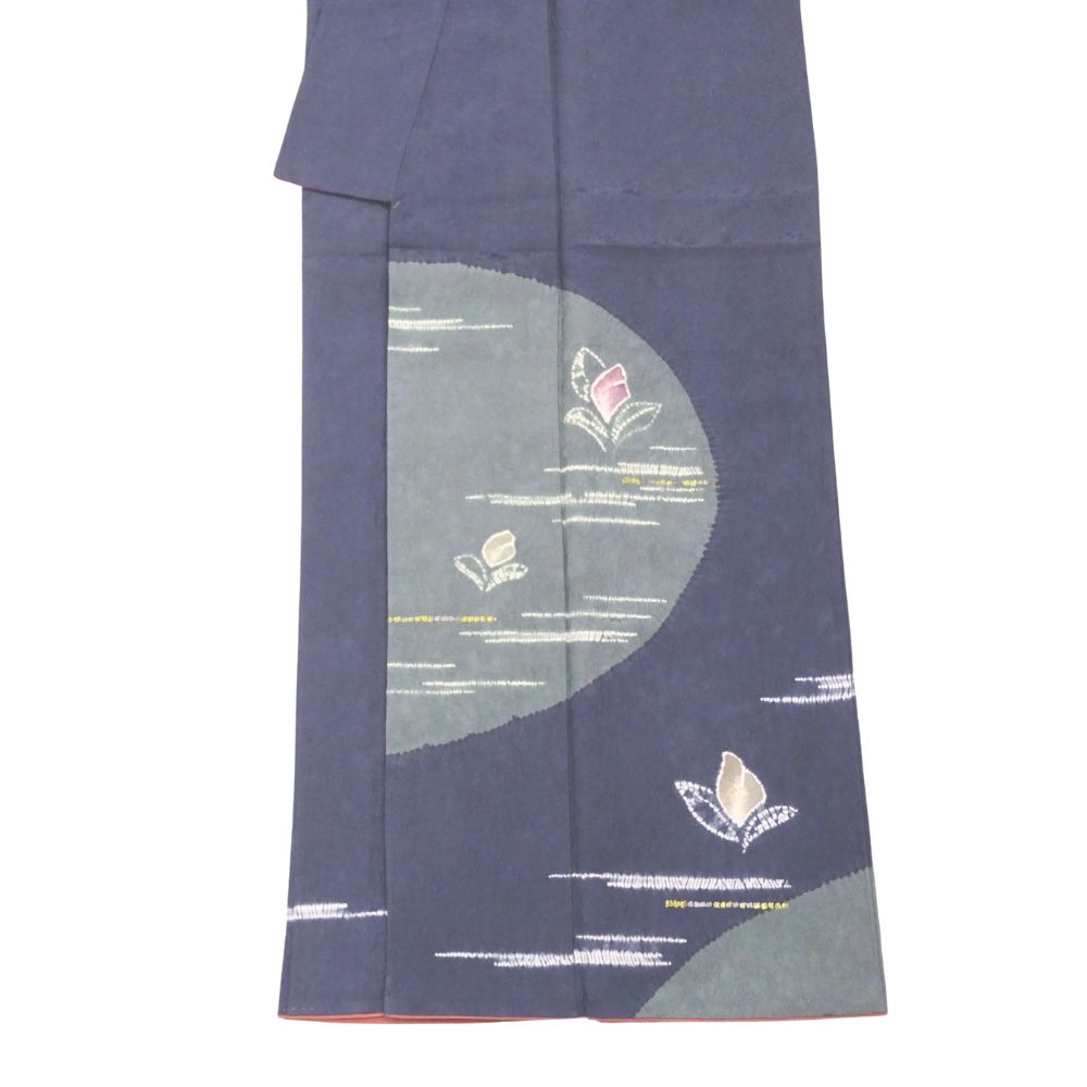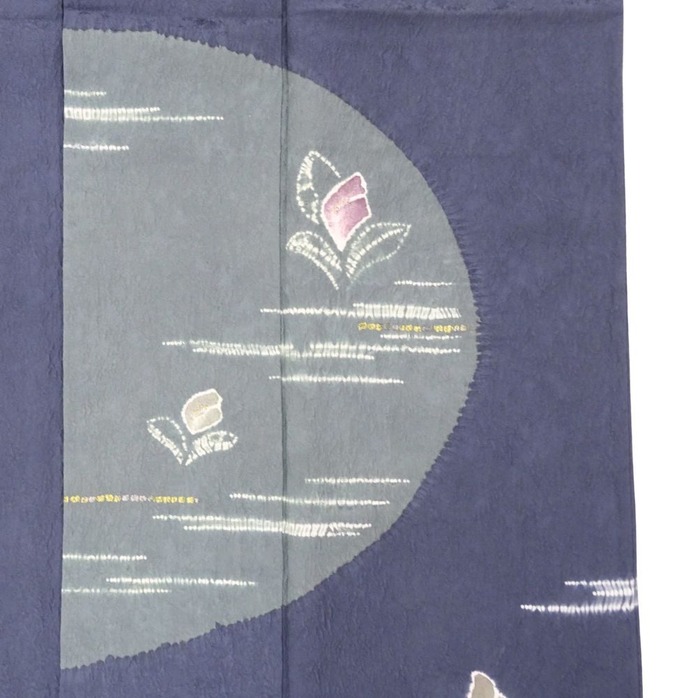 落ち着きのある深い紺青色の地に、幻想的な月と花が描かれた、非常に洗練された附下です。