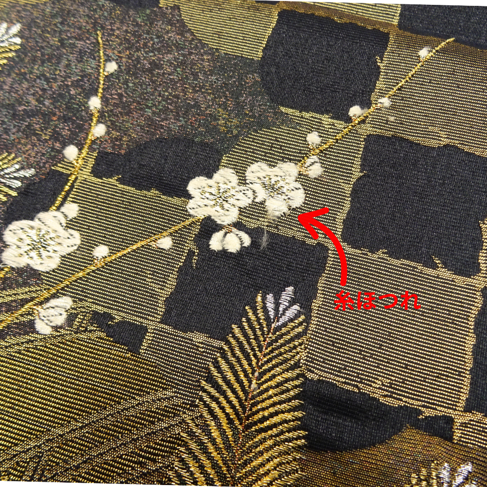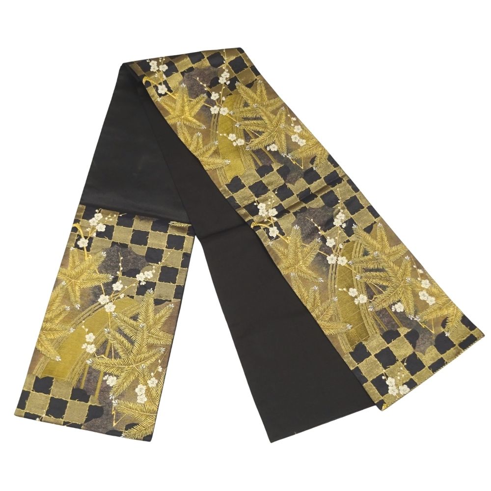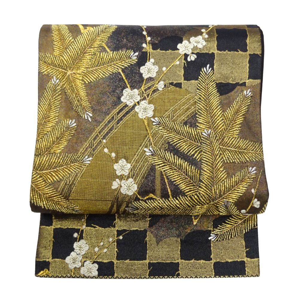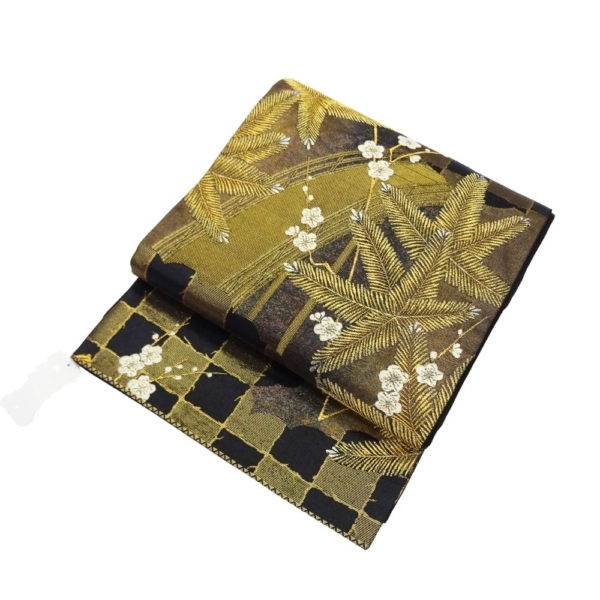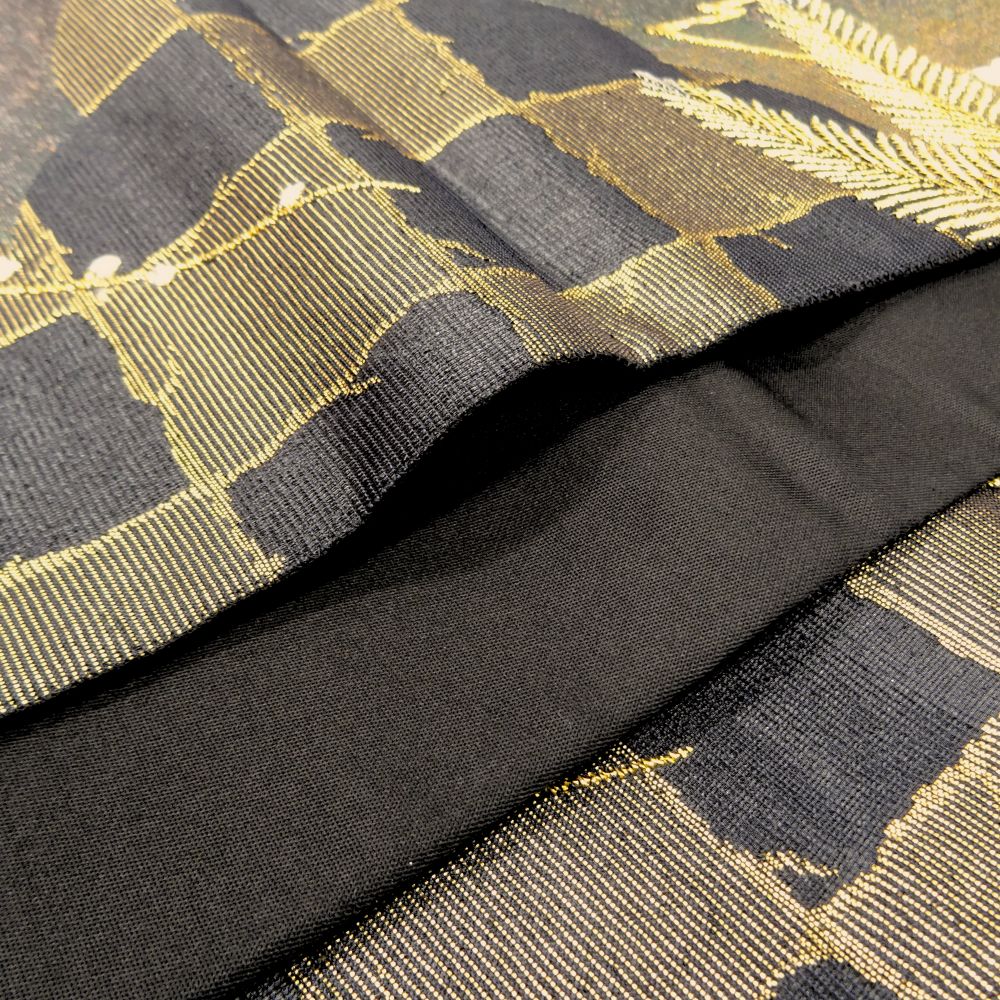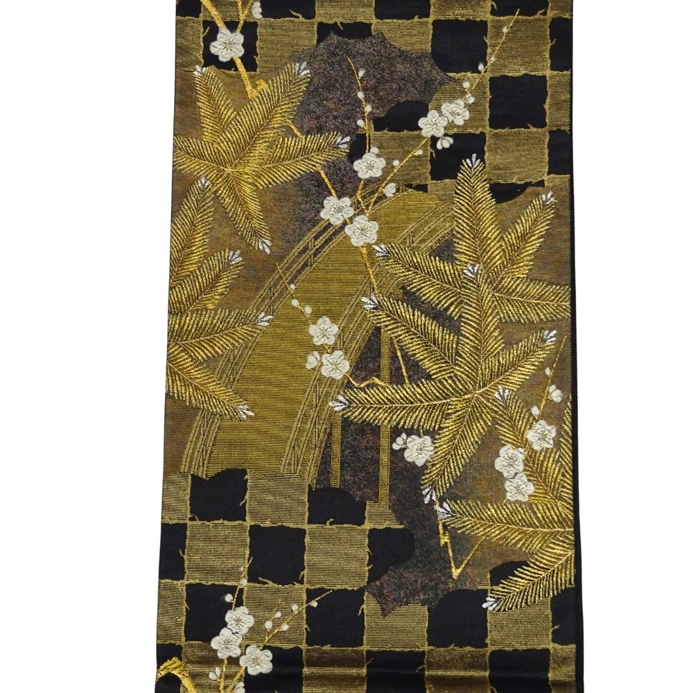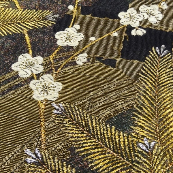 地色はシックな黒。そこに金糸をベースにした松葉が力強く織り出されています。
