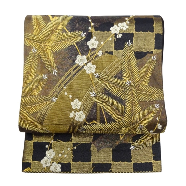 振袖用袋帯 正絹 リユース 中古 金彩 松葉 梅 市松文様 六通柄 K10-010-48(8050-00696)
