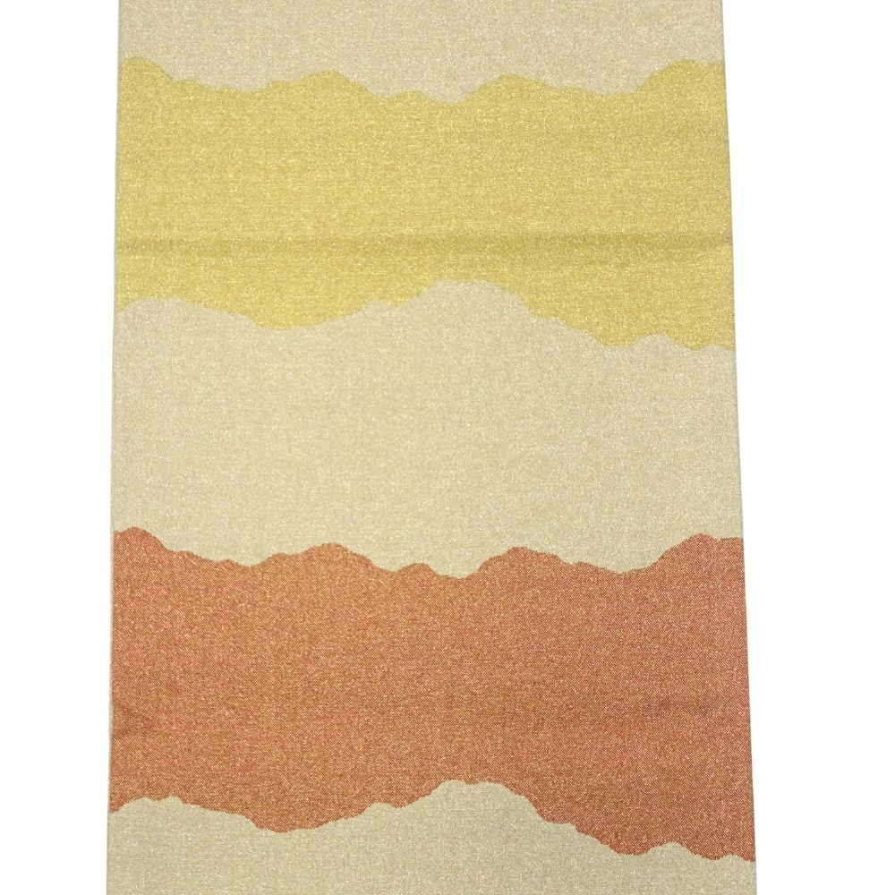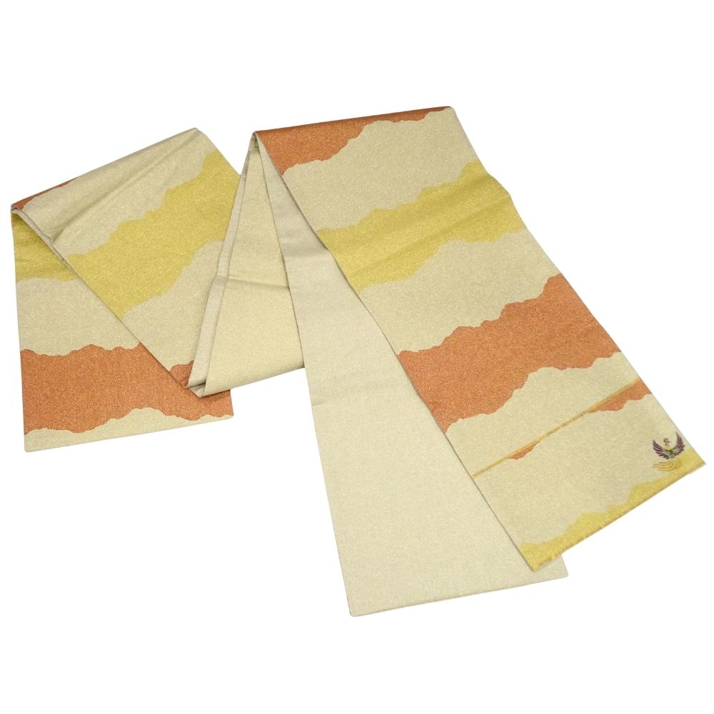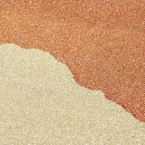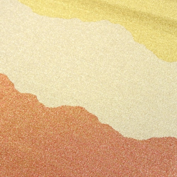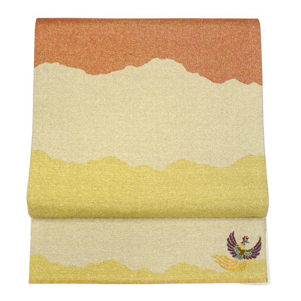 上部には、山並みや霞を思わせる曲線的な雲取文様が、オレンジ、イエロー、淡金色のグラデーションで表現されており、奥行きと格式を感じさせます。