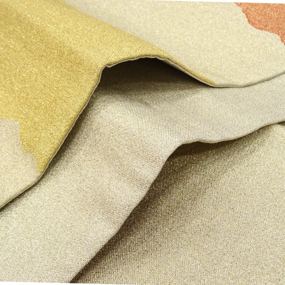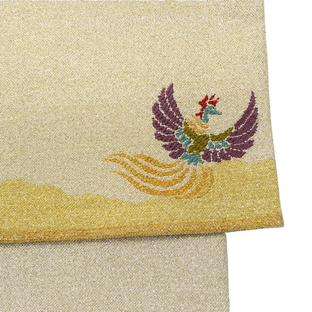 帯地全体に金銀糸が織り込まれ、角度によって上品な光沢を放つ淡金色を基調としています。