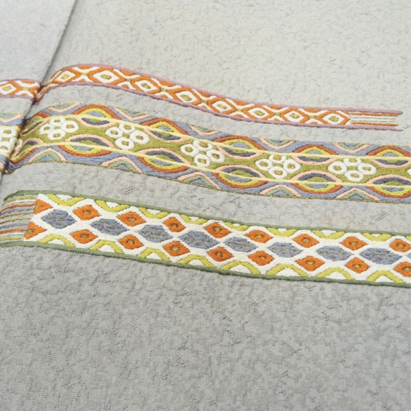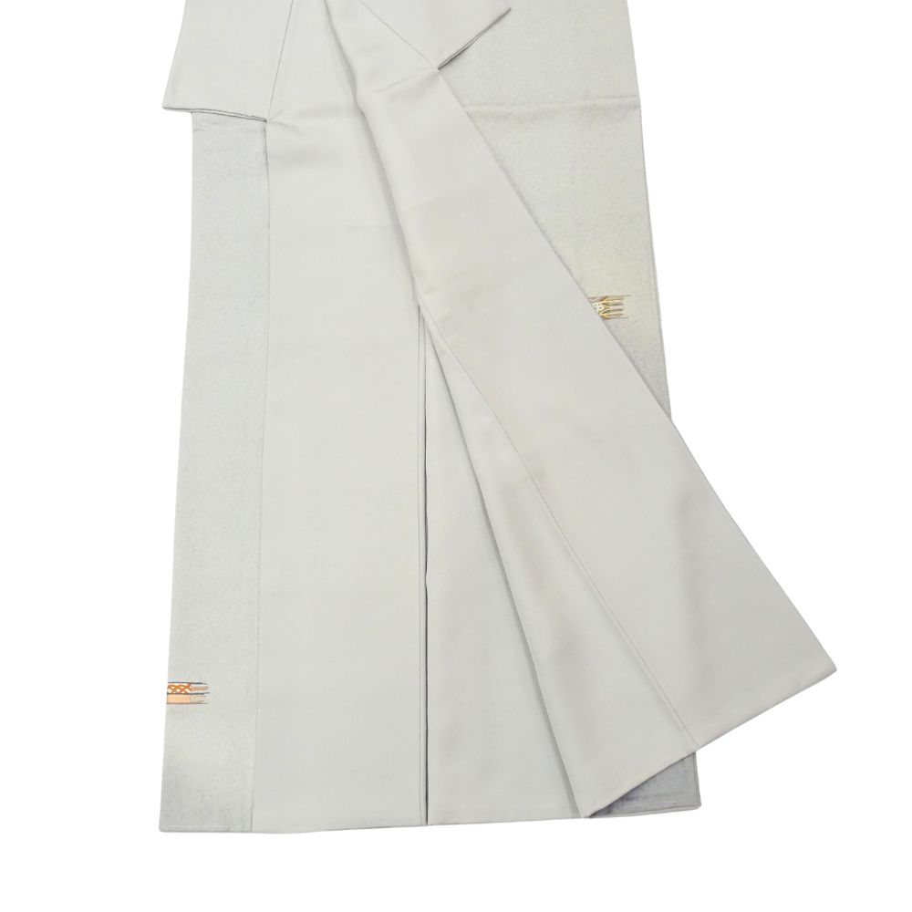 淡いオレンジやグリーンの差し色が、グレーの地に優しく映え、さりげない金彩がフォーマルな場にふさわしい華やぎを添えています。
