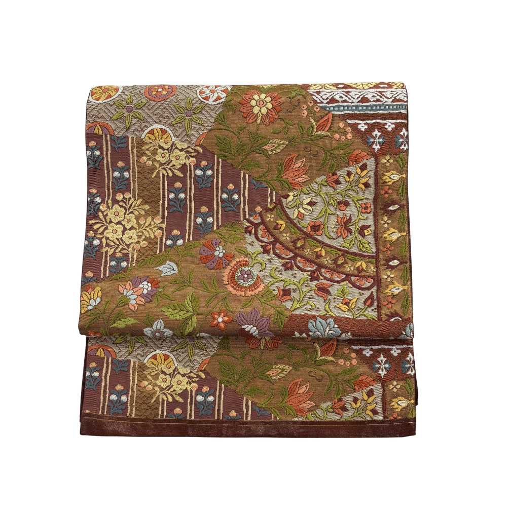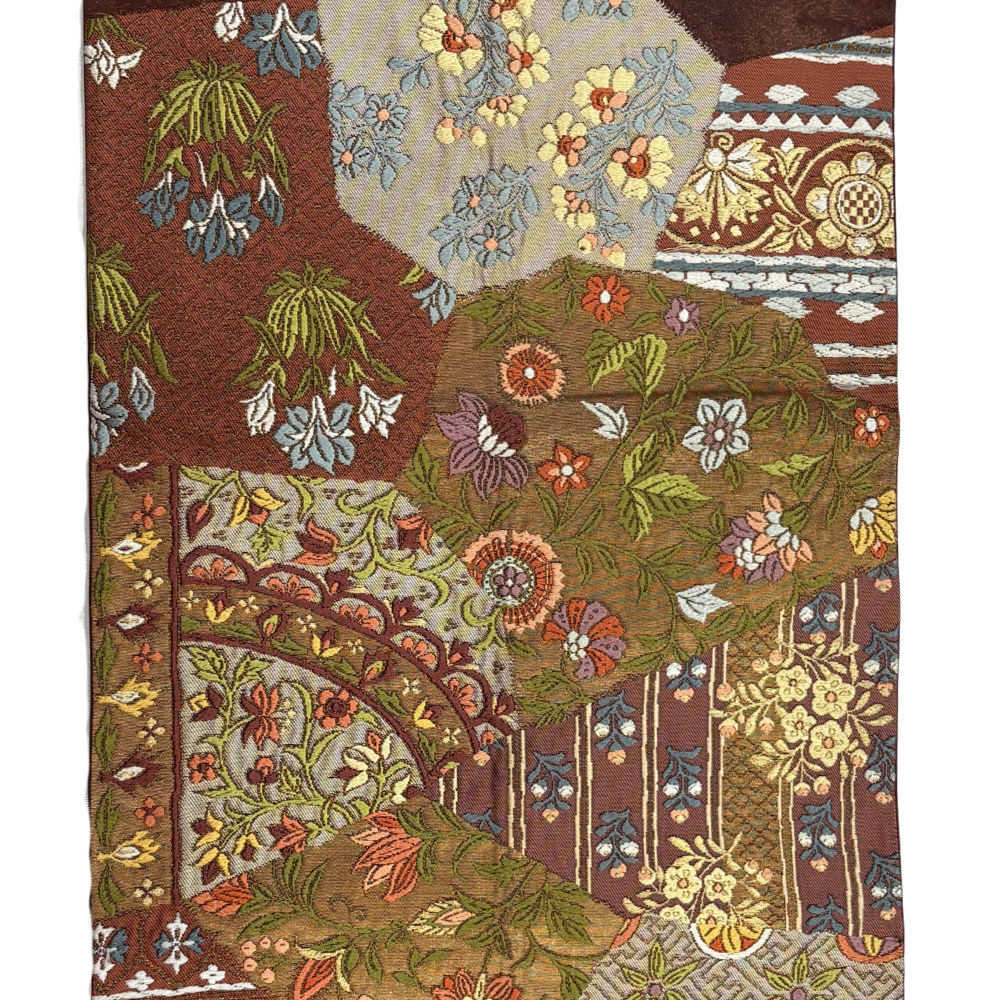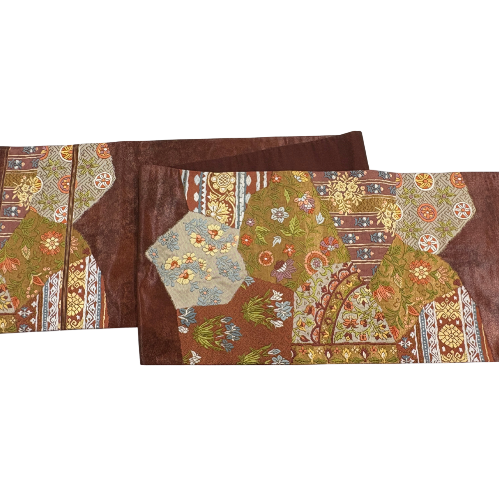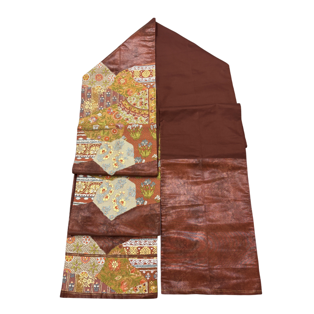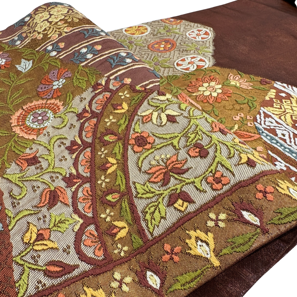 礼装用袋帯 正絹 リユース 中古 唐花文様 パッチワーク調 茶系 k109-04-7(8050-00541)