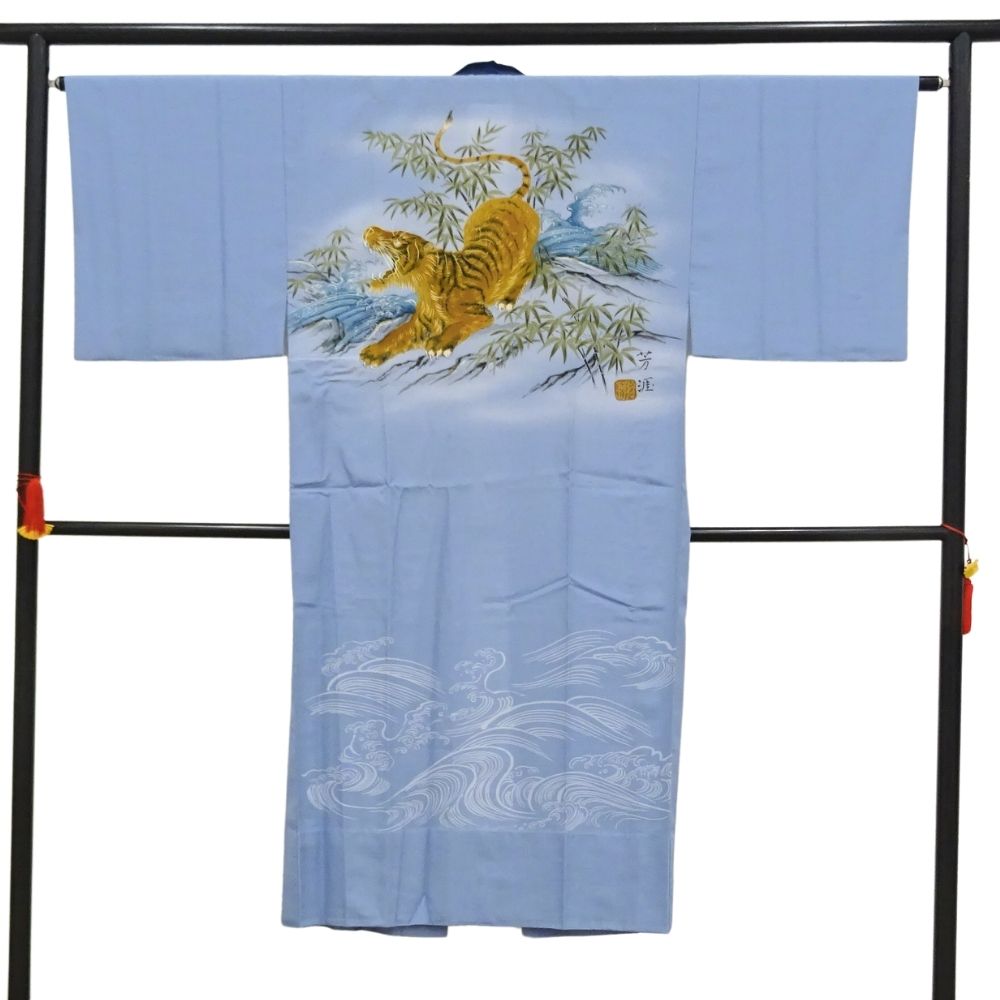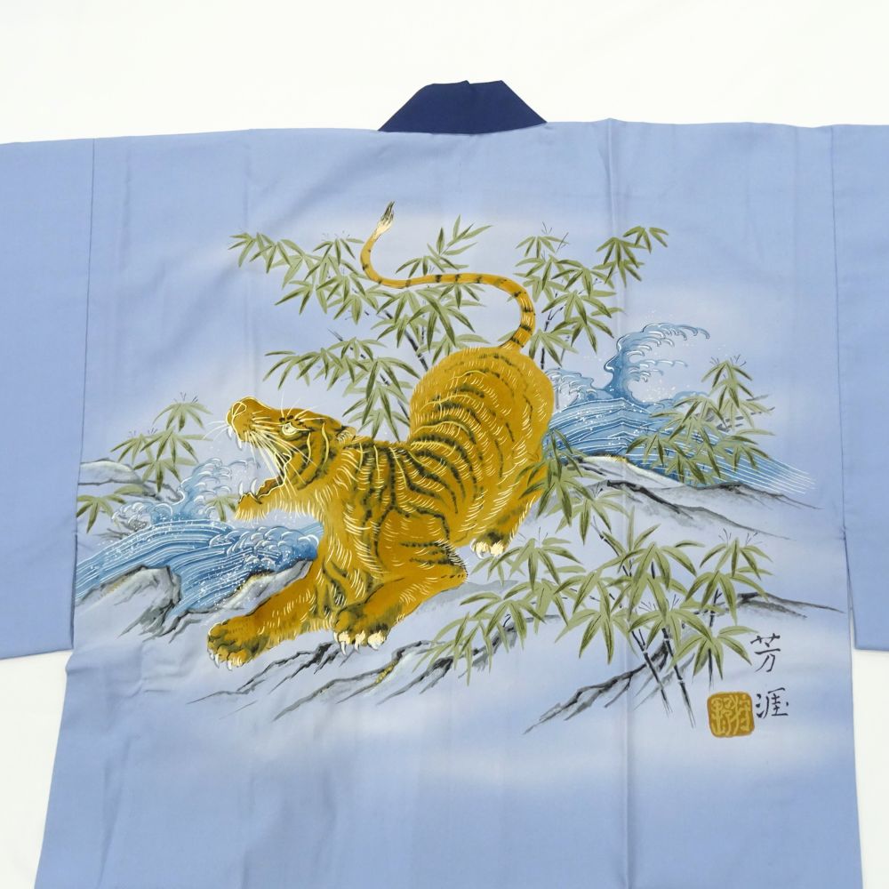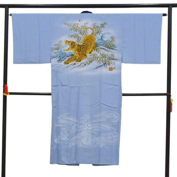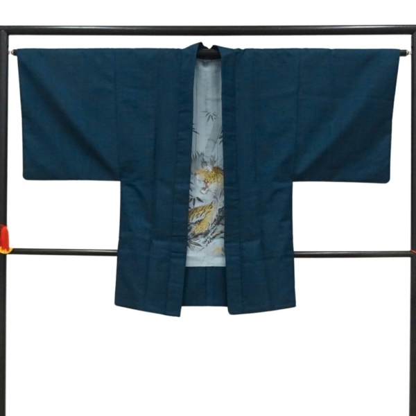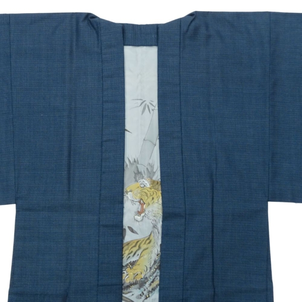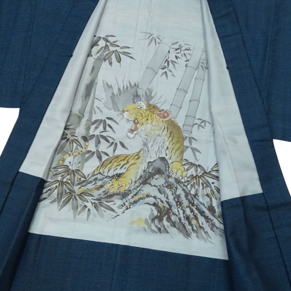 羽裏は竹林と荒波を背景に吠える虎がダイナミックに描かれていて、見えない部分にお洒落を凝らす、日本伝統の「粋」を体現した一着です。