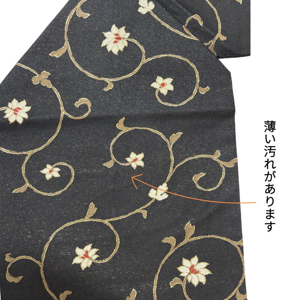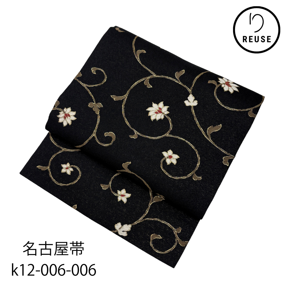 名古屋帯 正絹 リユース 中古 黒地 花唐草文様 シック k12-006-006