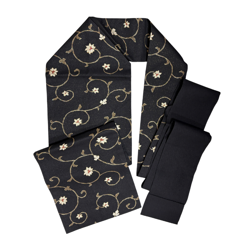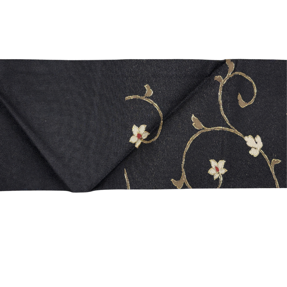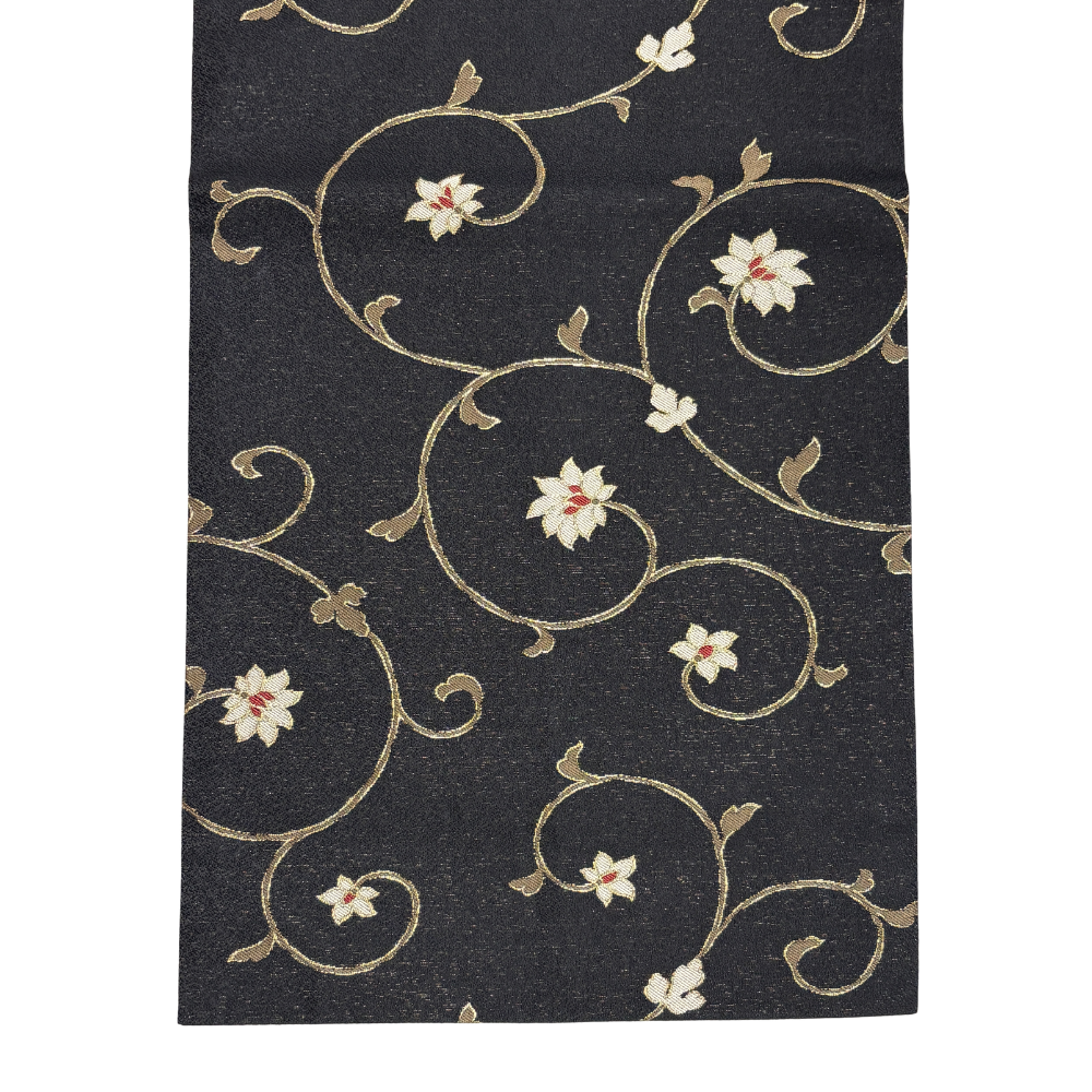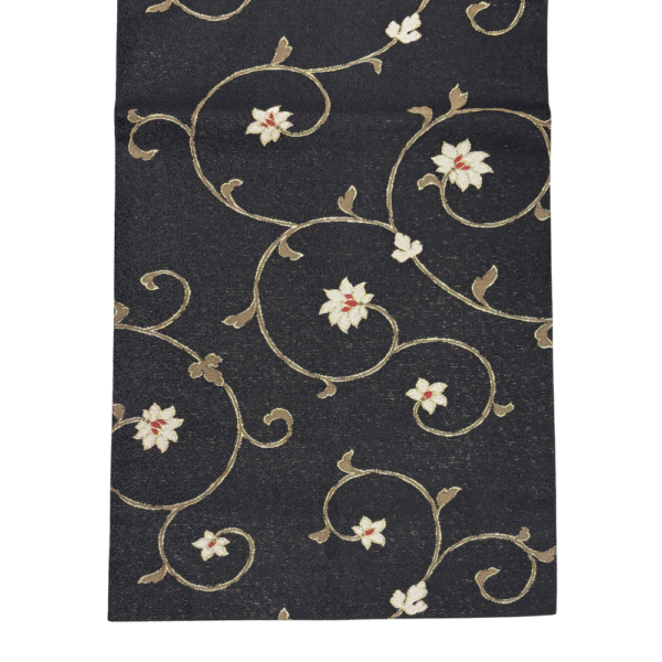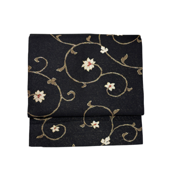 シックな黒地に、エレガントな花唐草文様が施された名古屋帯です。