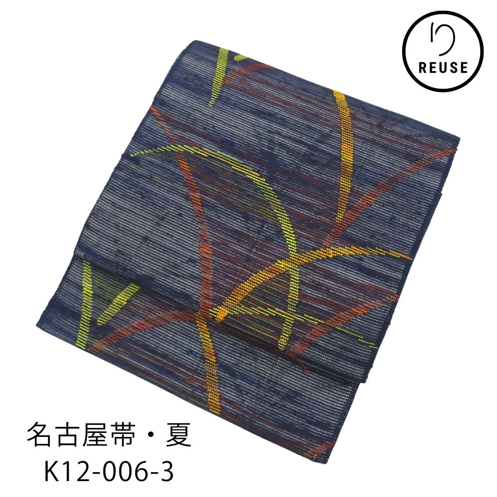 名古屋帯 夏 正絹 リユース 中古 紺地 幾何学曲線文様 K12-006-3(8050-00944)