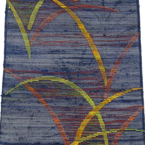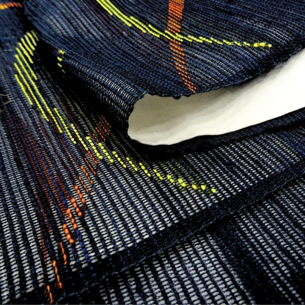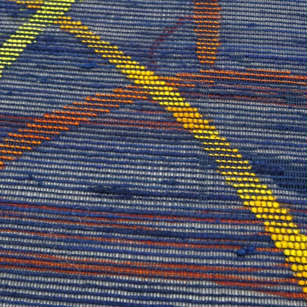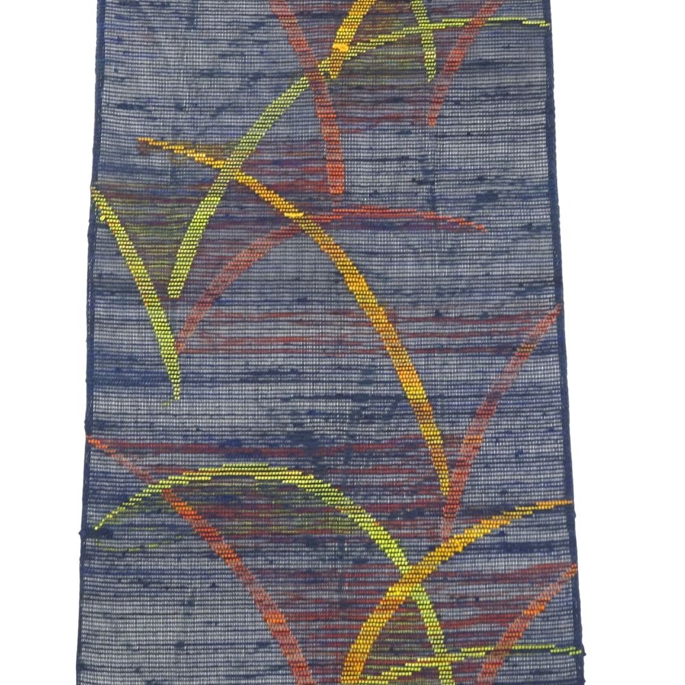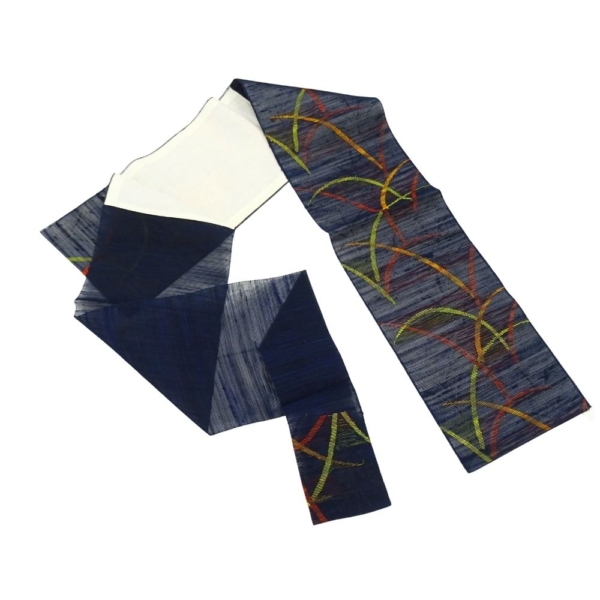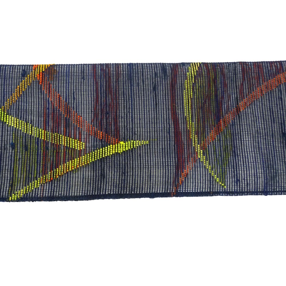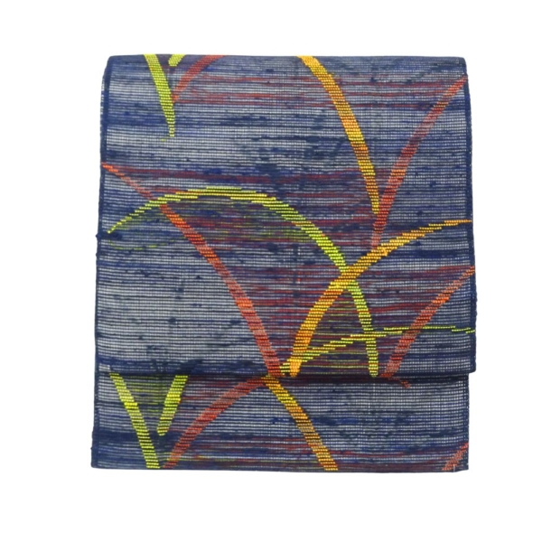 深いネイビーの地に、鮮やかなイエローやオレンジのグラデーションが映える、非常にモダンな夏名古屋帯です。