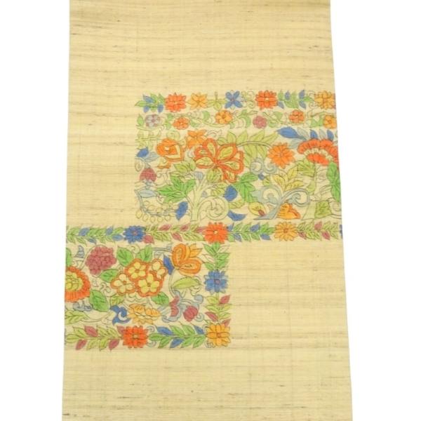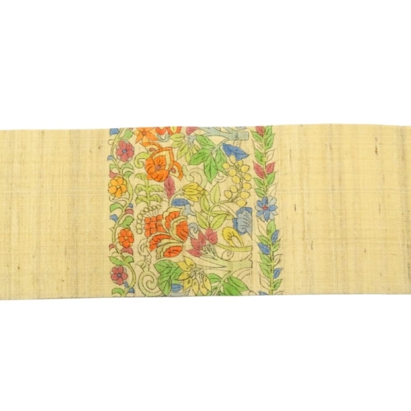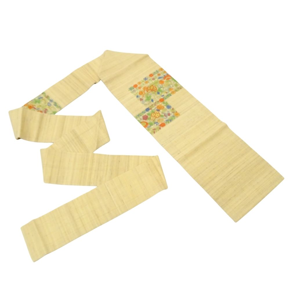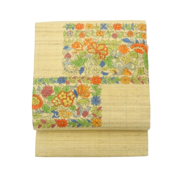 名古屋帯 正絹 リユース 中古 野蚕 紬地 更紗草花文様 ベージュ系 K12-006-4(8050-00945)手描き風 カジュアル 普段着