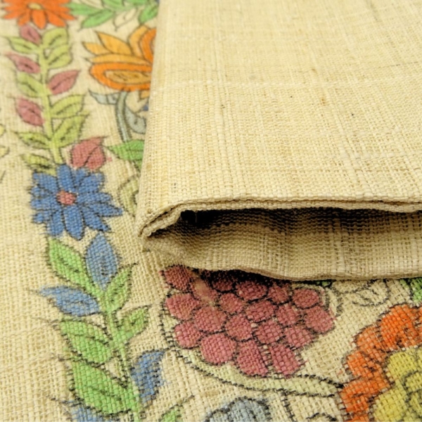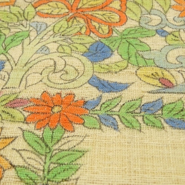 肌馴染みの良い落ち着いたベージュの地色に、オレンジ、青、緑といった多色使いの更紗風草花文様が丁寧に描かれています。