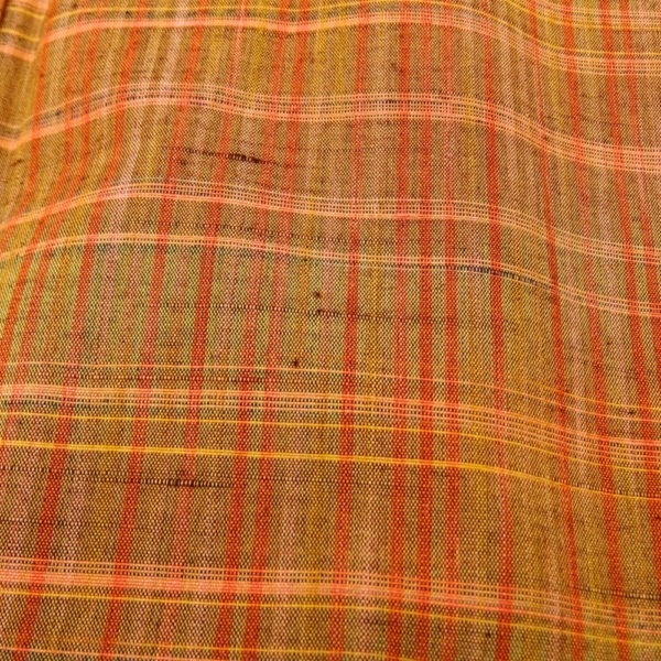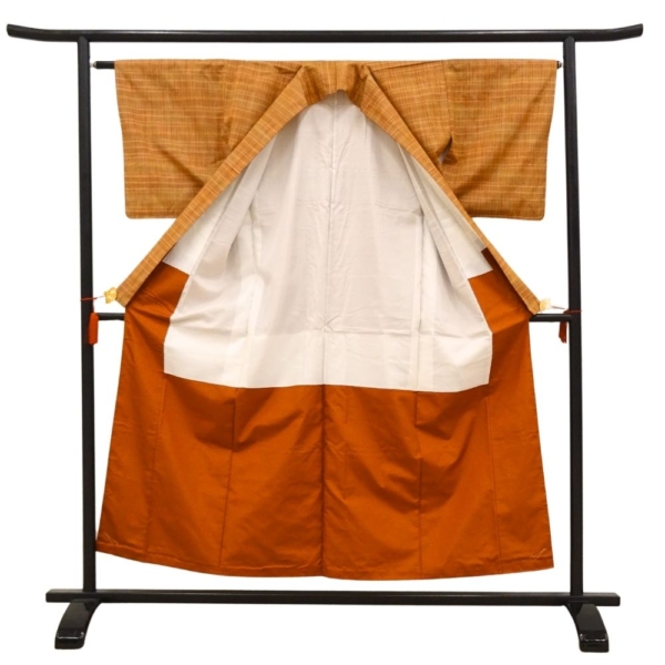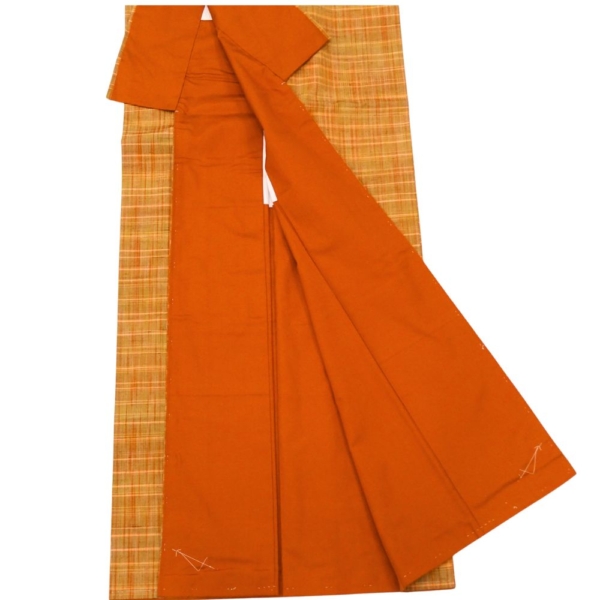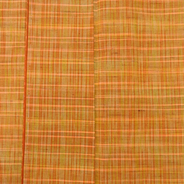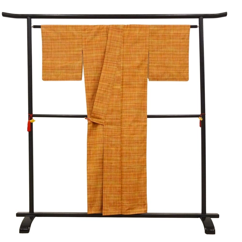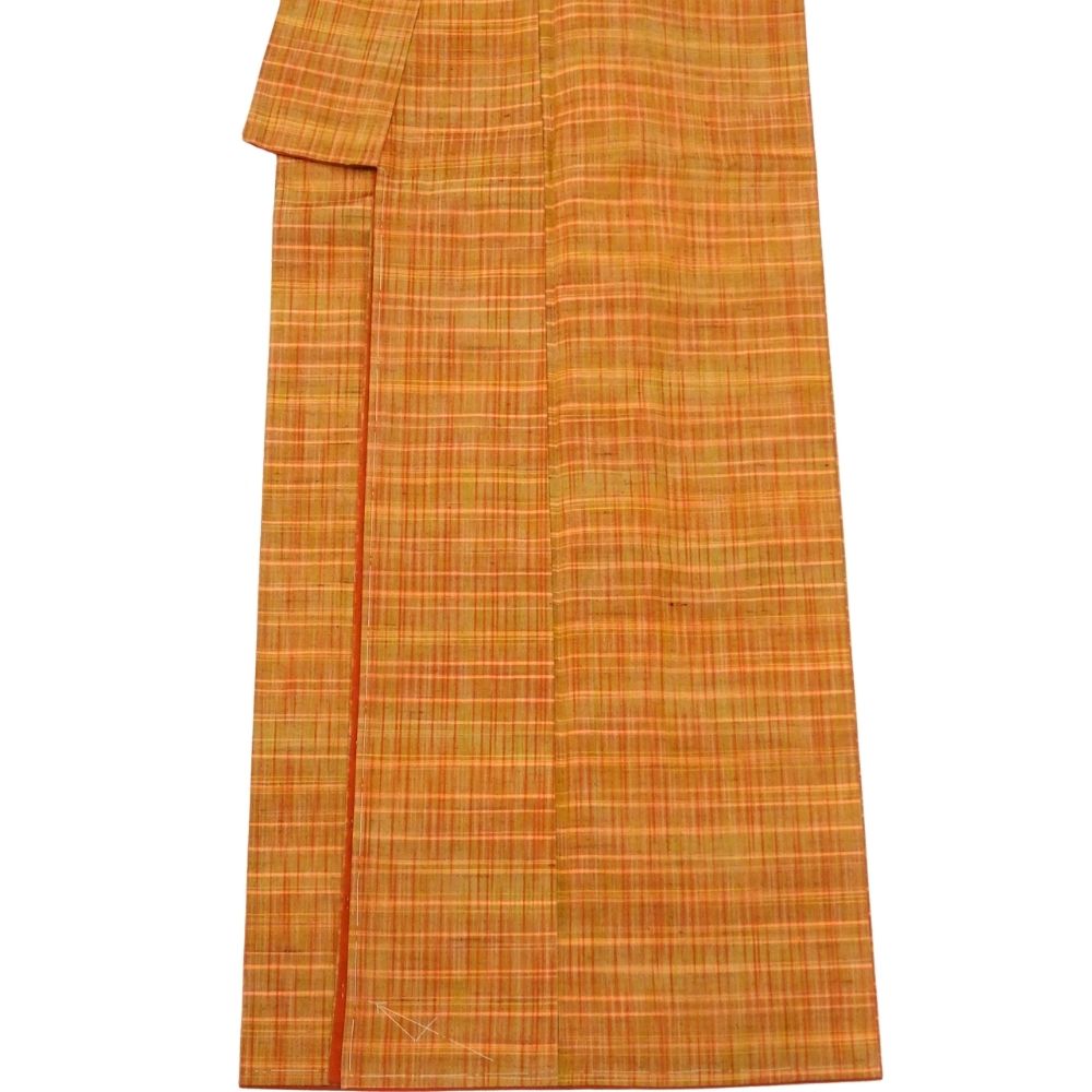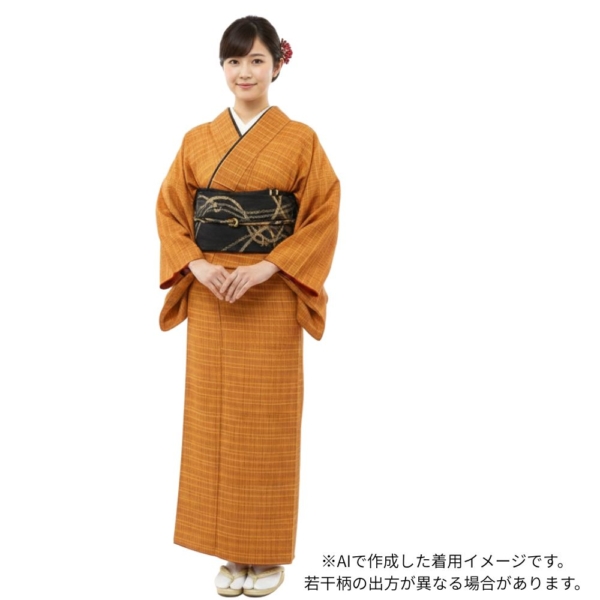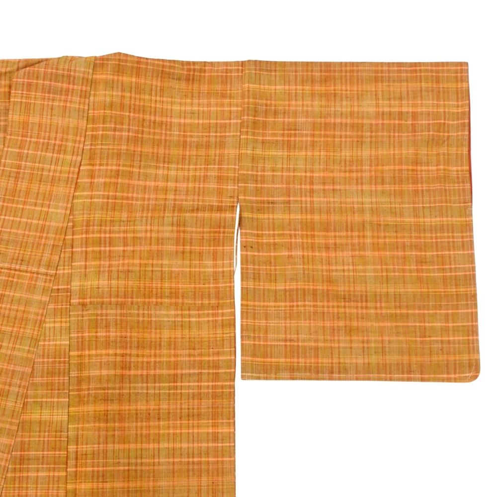 温かみのあるオレンジやイエロー系の色糸が織りなす、格子柄が美しい紬の着物です。
