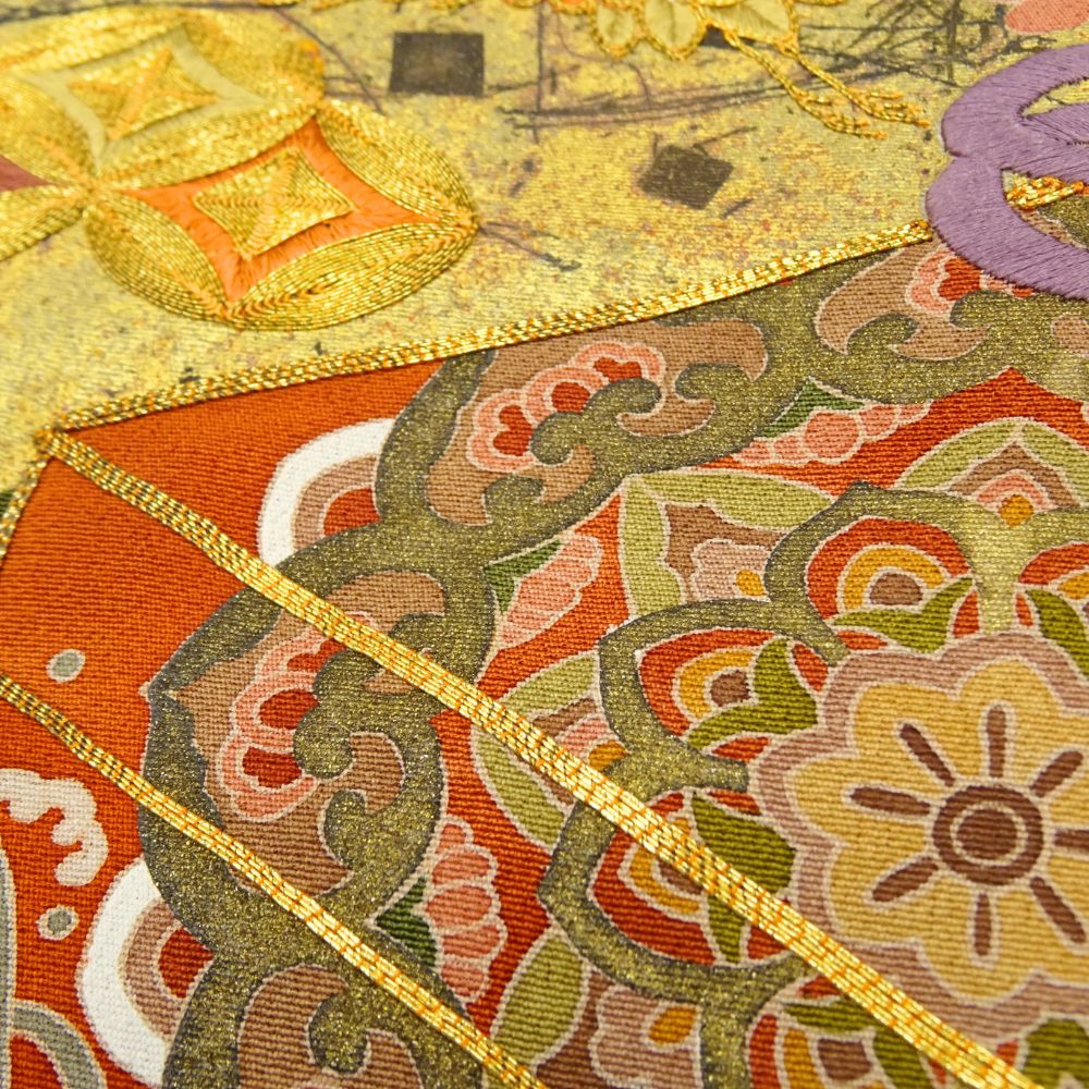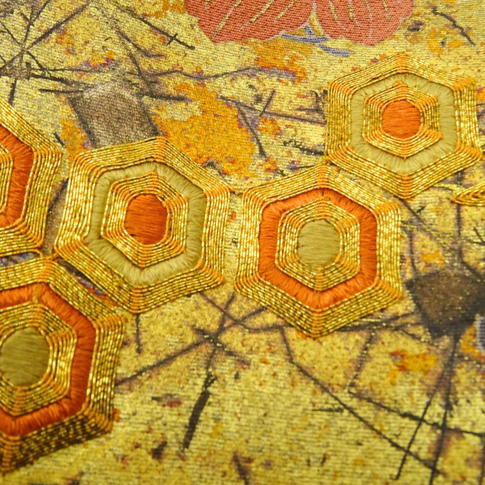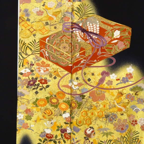 裾模様には、縁起の良い貝桶を中心に、優雅に舞う鶴、松竹梅、四季の花々が緻密に描かれており、歩くたびに光を受けて煌めき、華やかな席にふさわしい気品と存在感を放ちます。