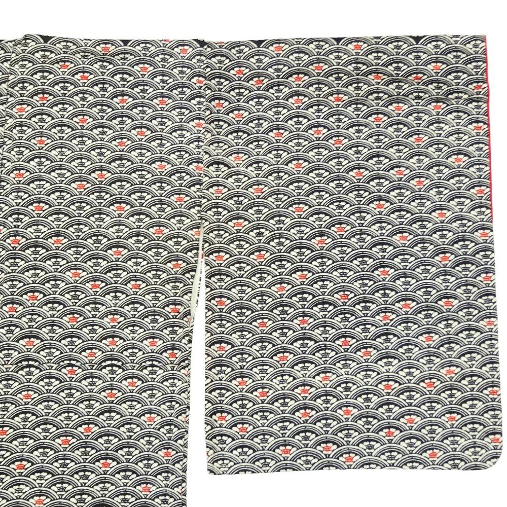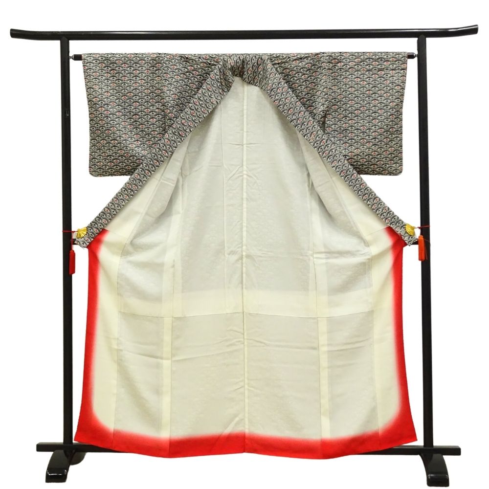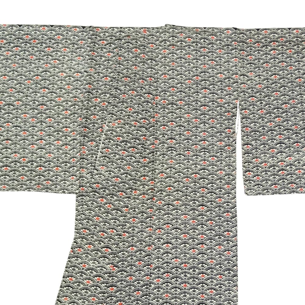 小紋 正絹 リユース 中古 黒地 青海波に花模様 k12-008-1 カジュアル 八掛赤 お洒落着 街着