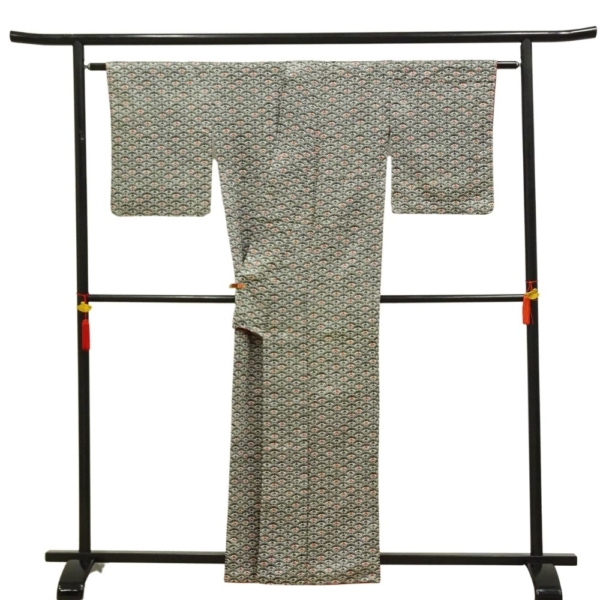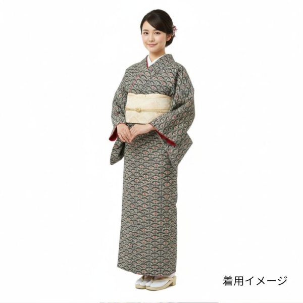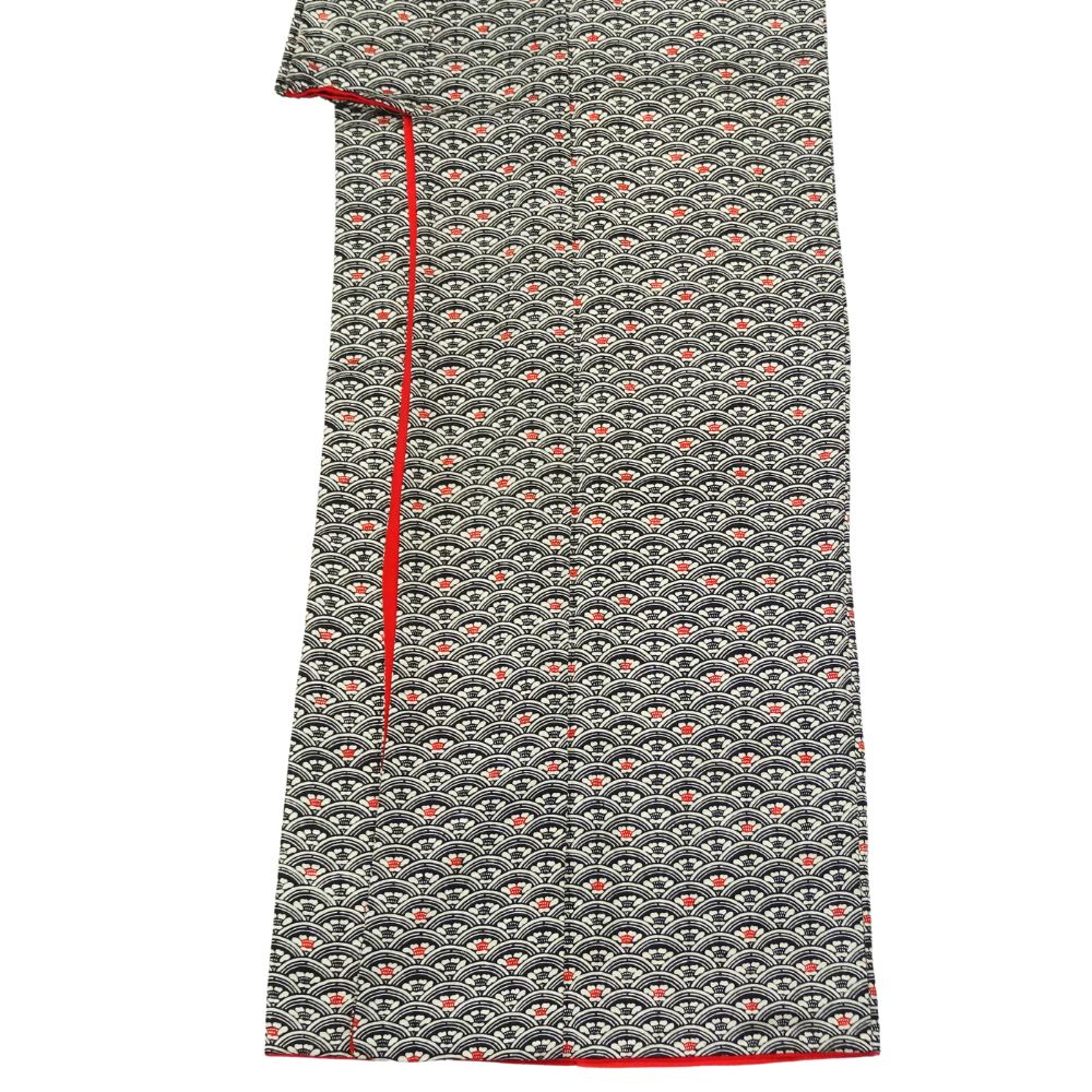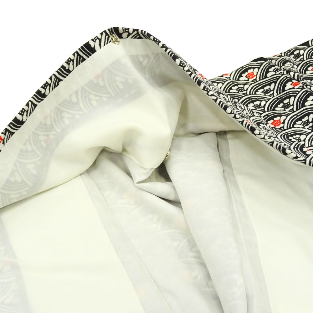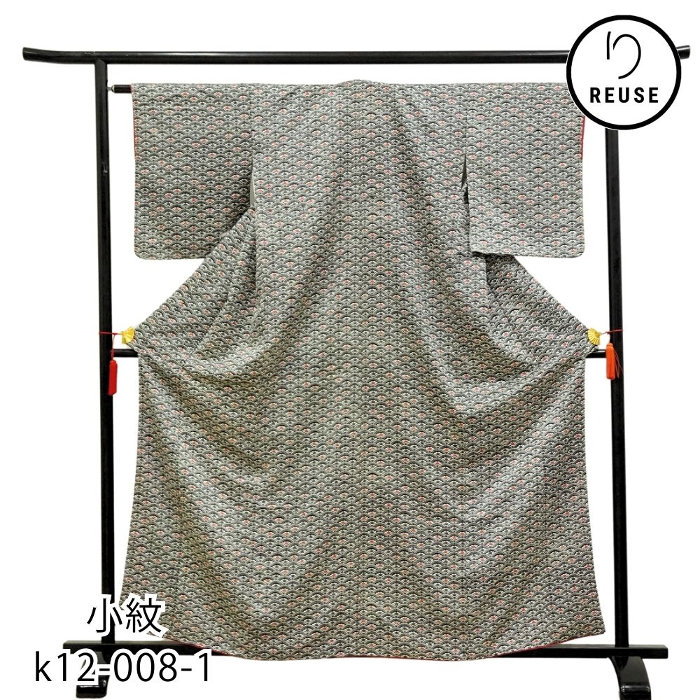 小紋 正絹 リユース 中古 黒地 青海波に花模様 k12-008-1 カジュアル 八掛赤 お洒落着 街着