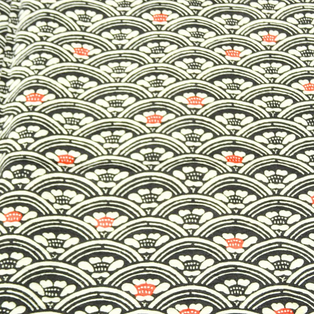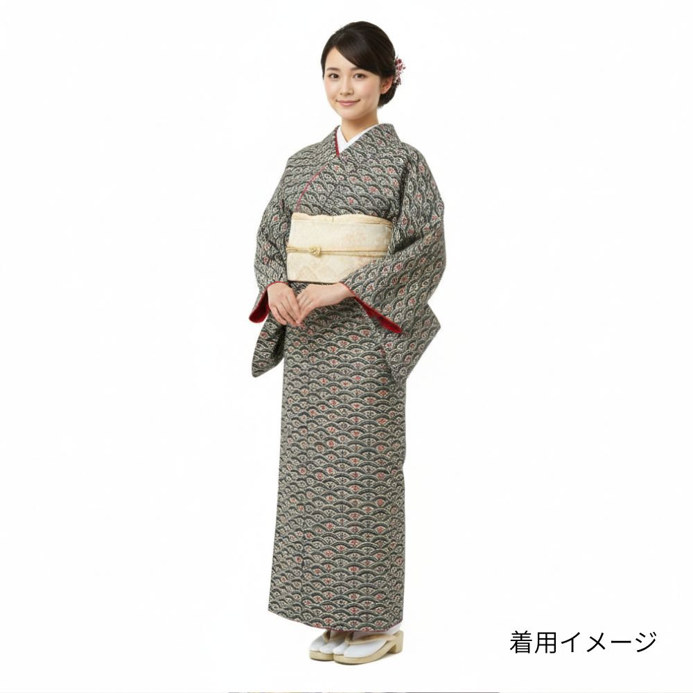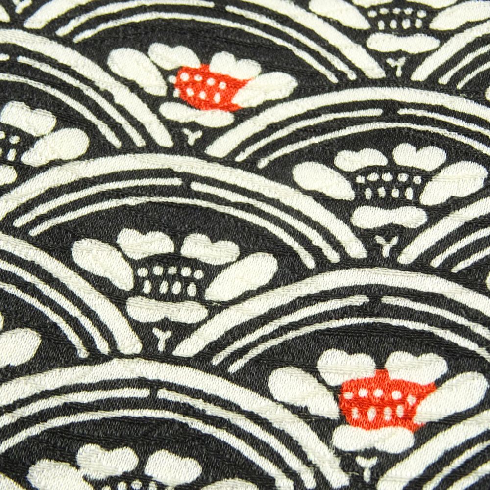 凛とした黒地に、途切れることなく繰り返される波を表現した青海波が敷き詰められた、格調高くも愛らしい小紋です。