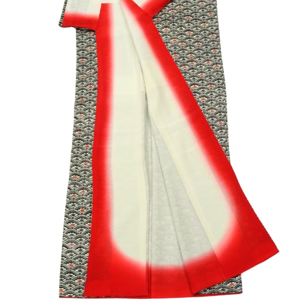 花の中心や八掛にあしらわれた鮮やかな赤が、歩くたびに裾から覗き、黒地の装いにハッとするような色香と躍動感を添えます。