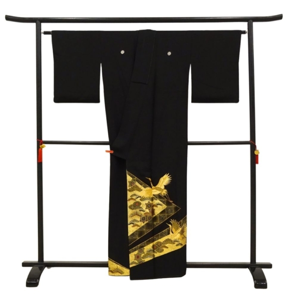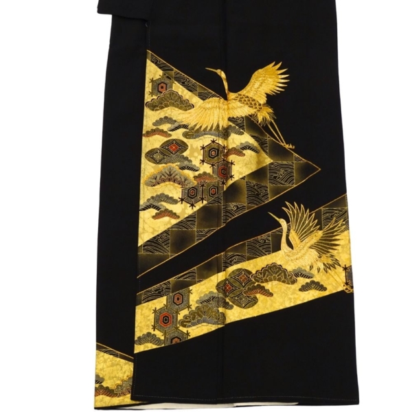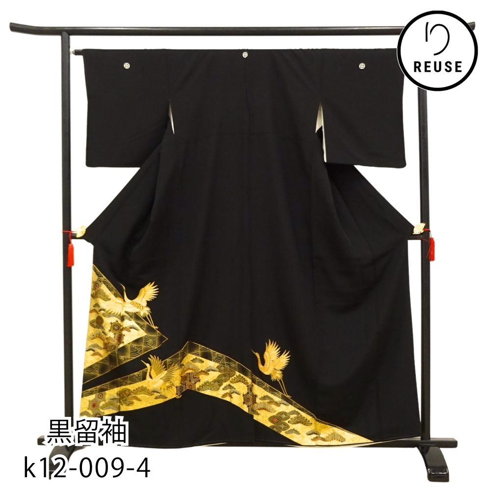 黒留袖 正絹 リユース 中古 五つ紋 比翼仕立て 金彩 刺繍 飛鶴に松竹梅 k12-009-4 豪華 第一礼装 結婚式 親族 仲人