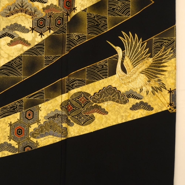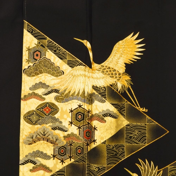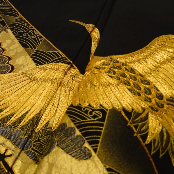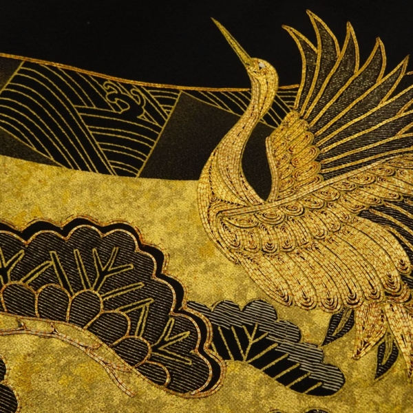 深く艶やかな黒地に、未来を祝し舞い上がる飛鶴が印象的に描かれた、慶事にふさわしい逸品です。