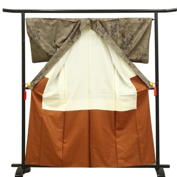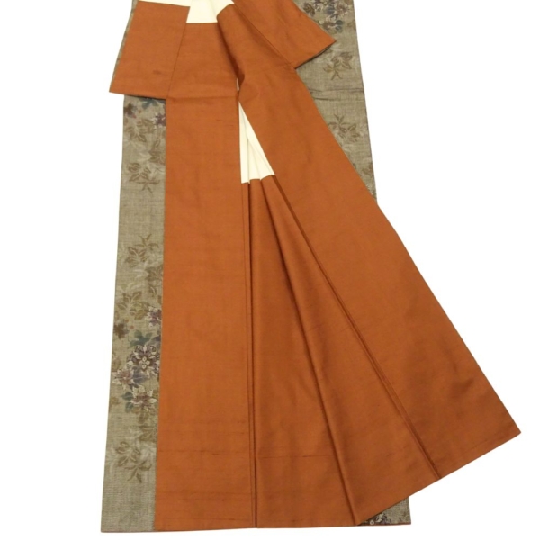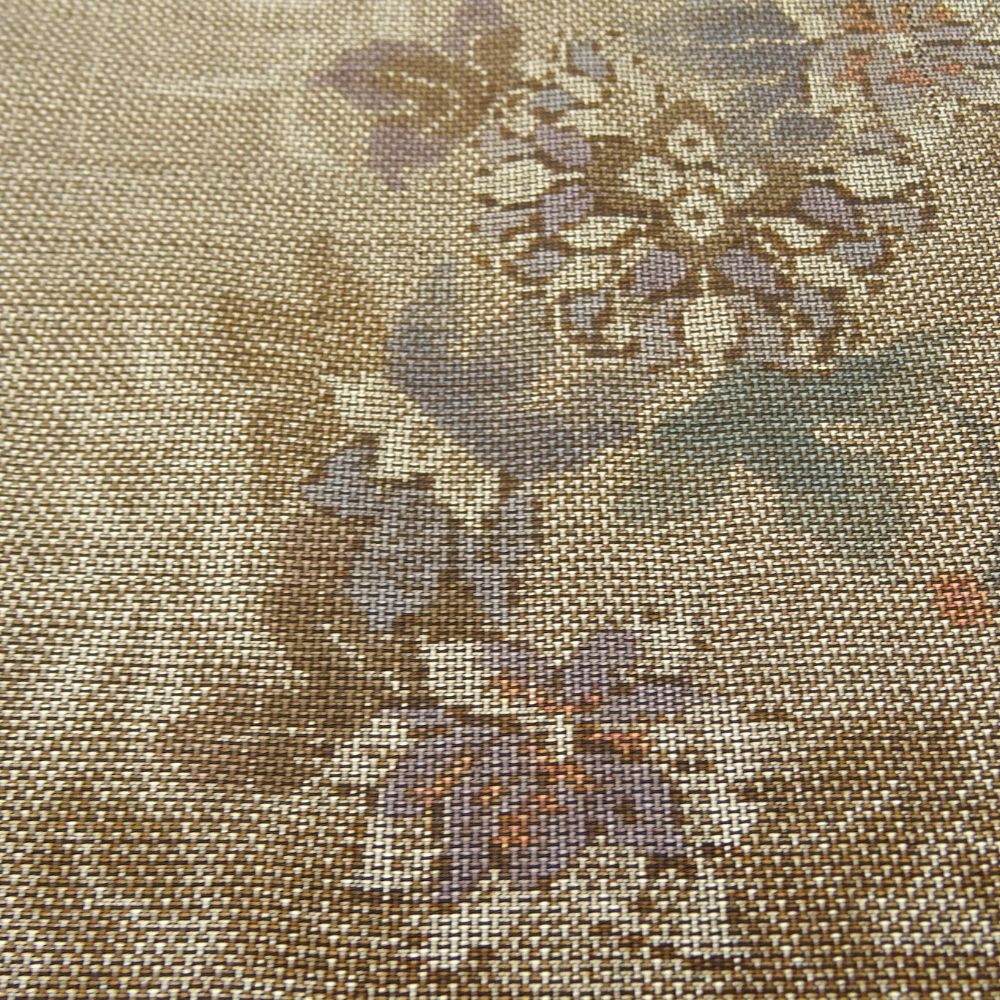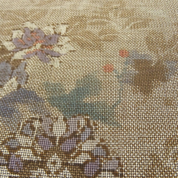 泥染めを思わせる深みのある茶系と、落ち着いた紫・青緑の糸で紡ぎ出された草花文様は、まるで一枚の絵画のような奥行きを感じさせます。