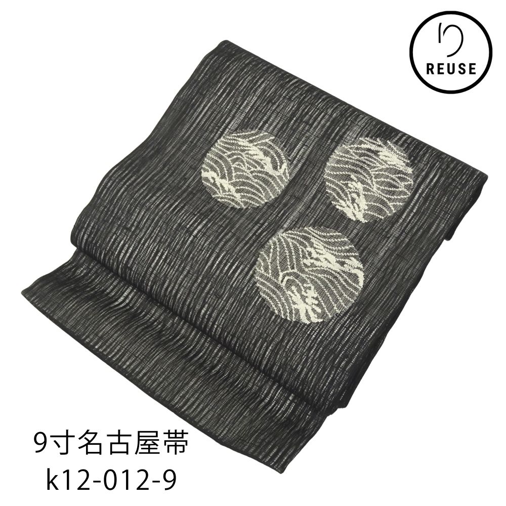 九寸名古屋帯 正絹 リユース 中古 黒 櫛織 波丸紋 k12-012-9(8050-00962) お洒落着 カジュアル 夏単衣