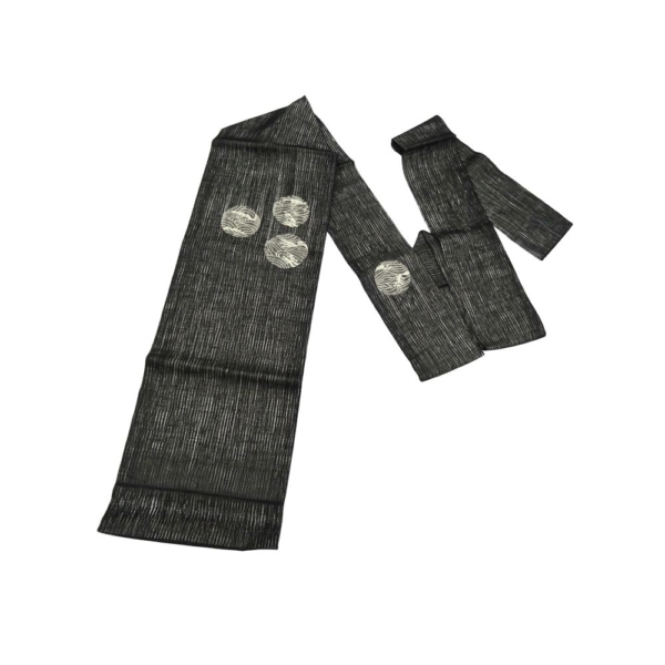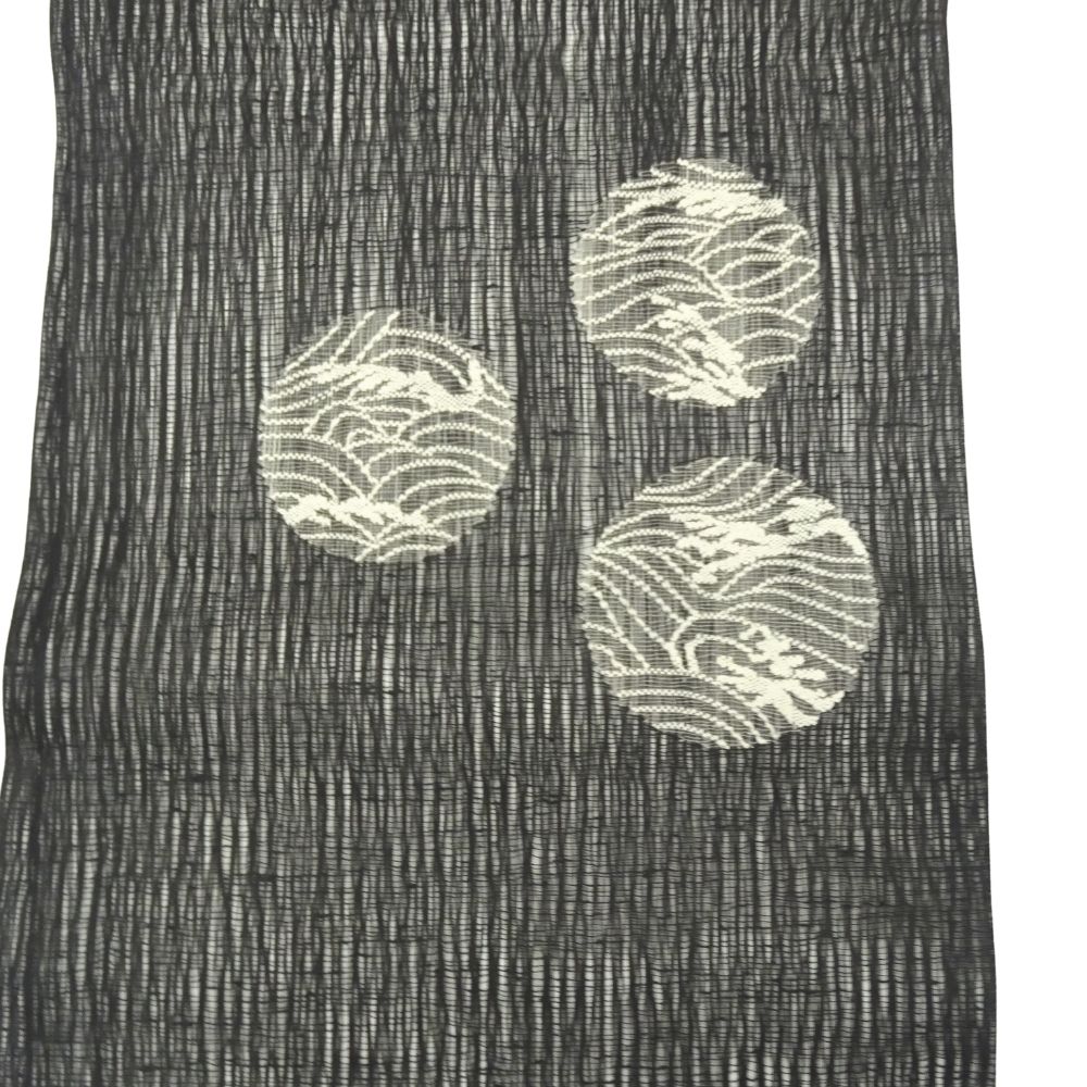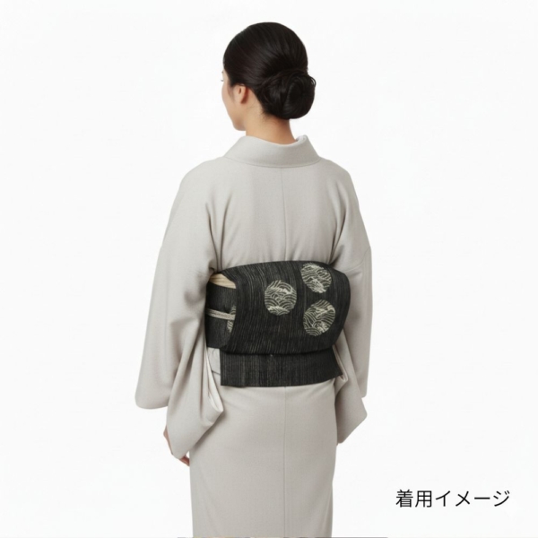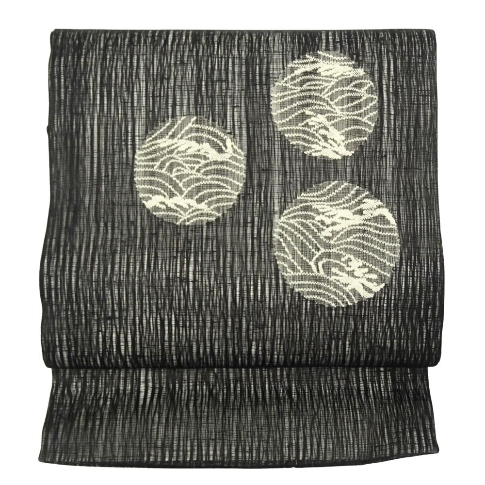 凛とした黒の地色に、波文様を円形に閉じ込めた丸紋が浮かび上がる、非常に洗練された九寸名古屋帯です。