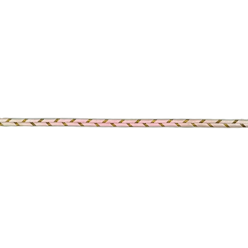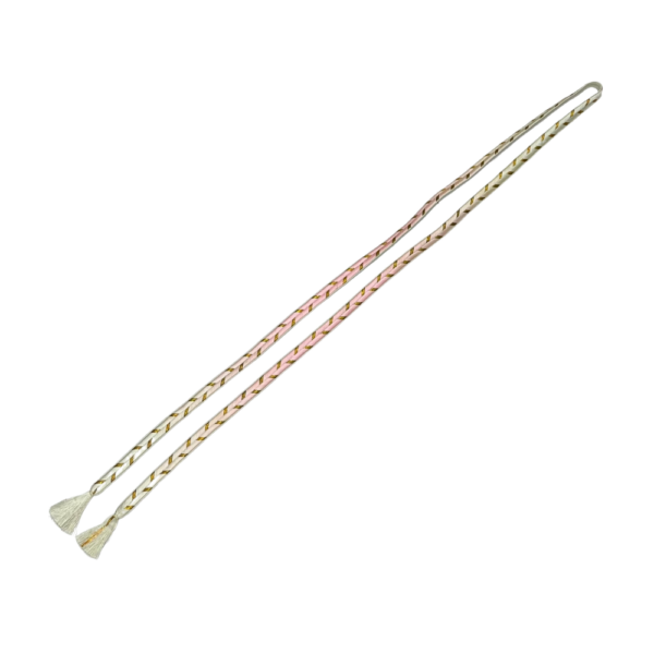 白を基調に、柔らかなピンクのぼかしと煌びやかな金糸を贅沢に組み込んだ帯締めです。