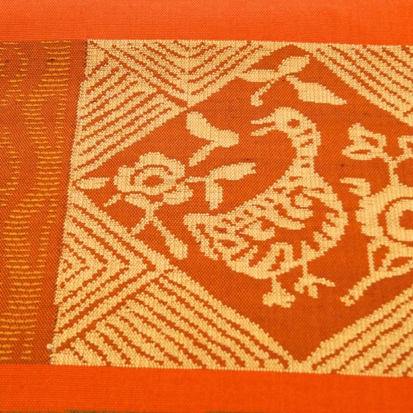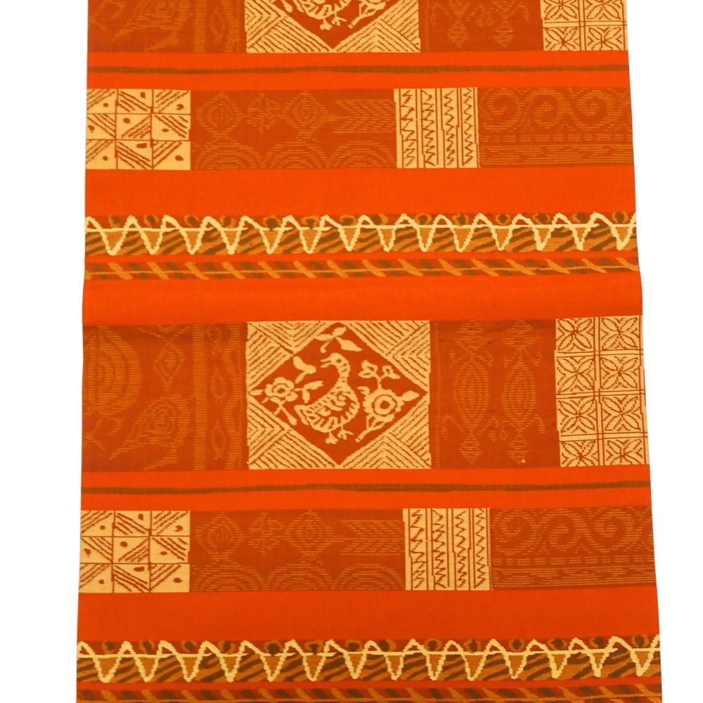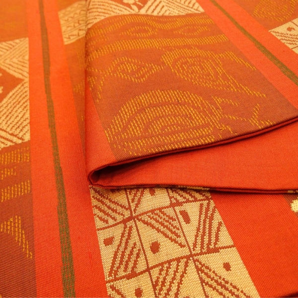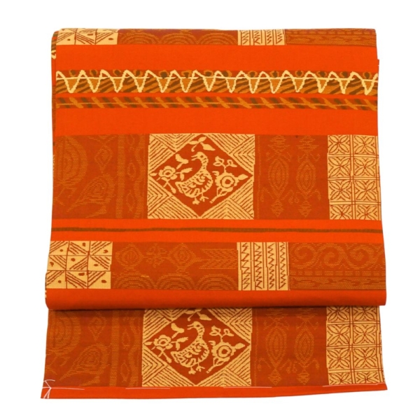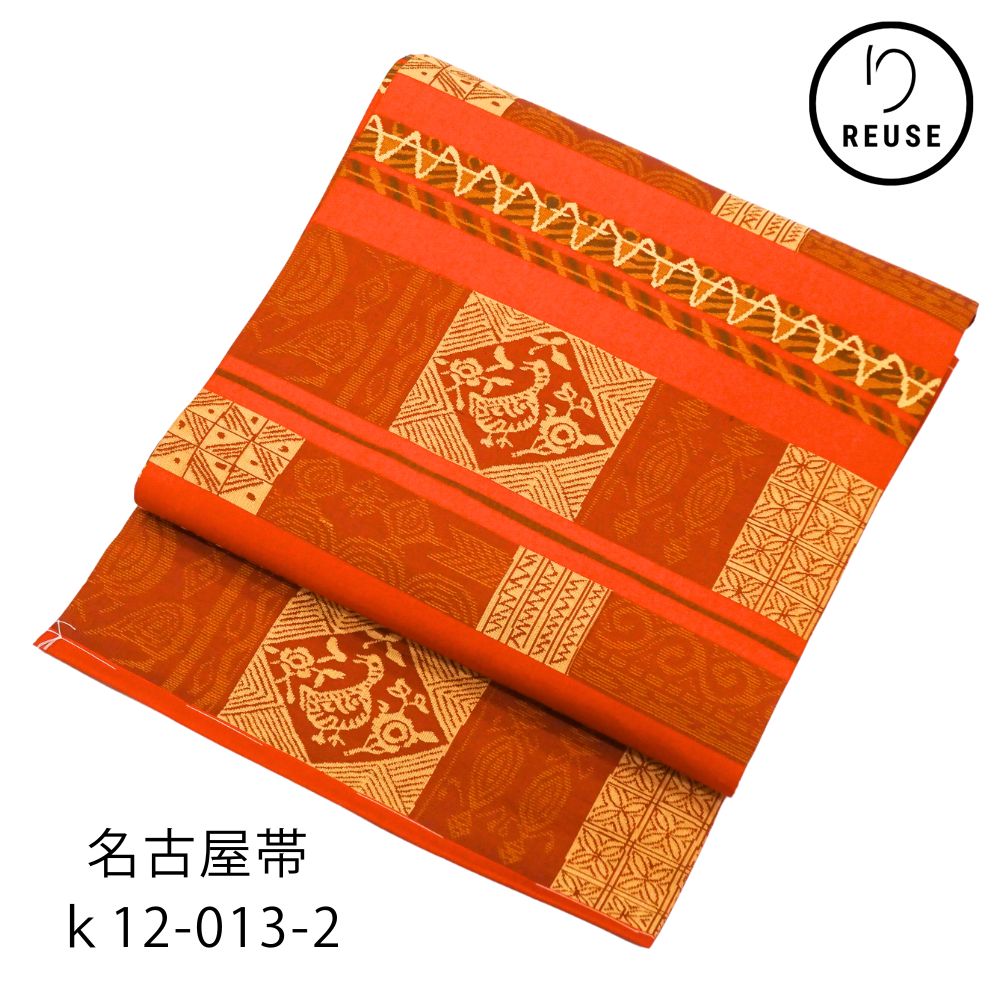 名古屋帯 正絹 リユース 赤茶色 幾何学鳥文様 菱紋 k12-013-2 カジュアル お洒落着 普段使い 街着