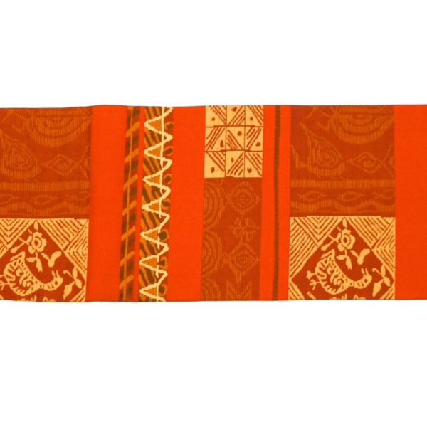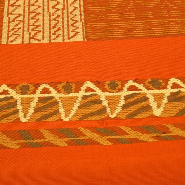 深みのあるテラコッタの地に、アイボリーの糸で織り出された意匠が目を引く名古屋帯です。