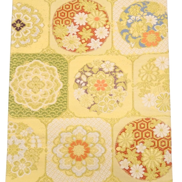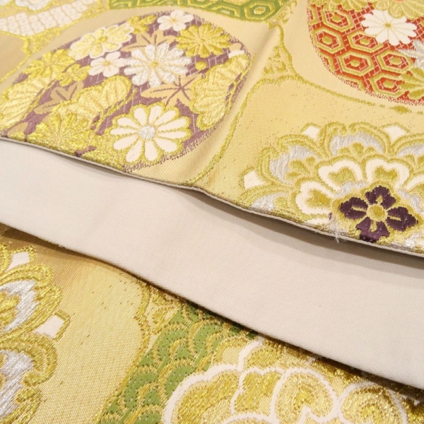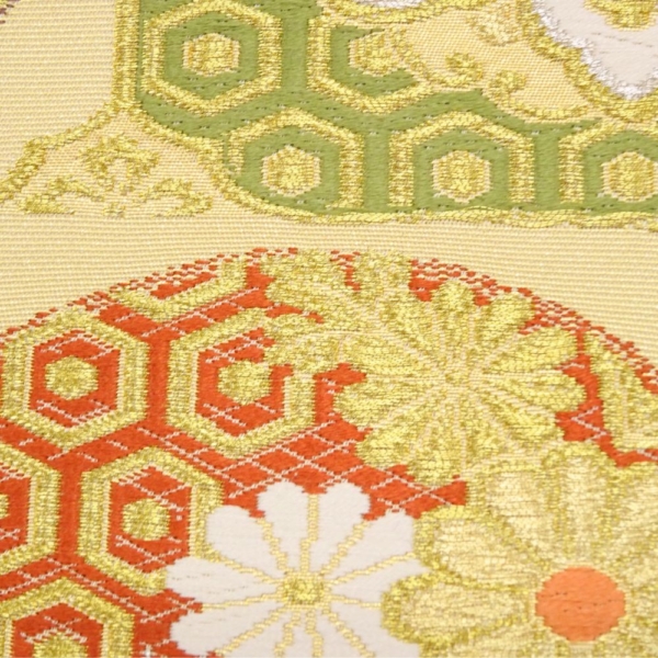 上品な金地に、色とりどりの糸で織り出された華文と六角花菱が非常に華やかな袋帯です。