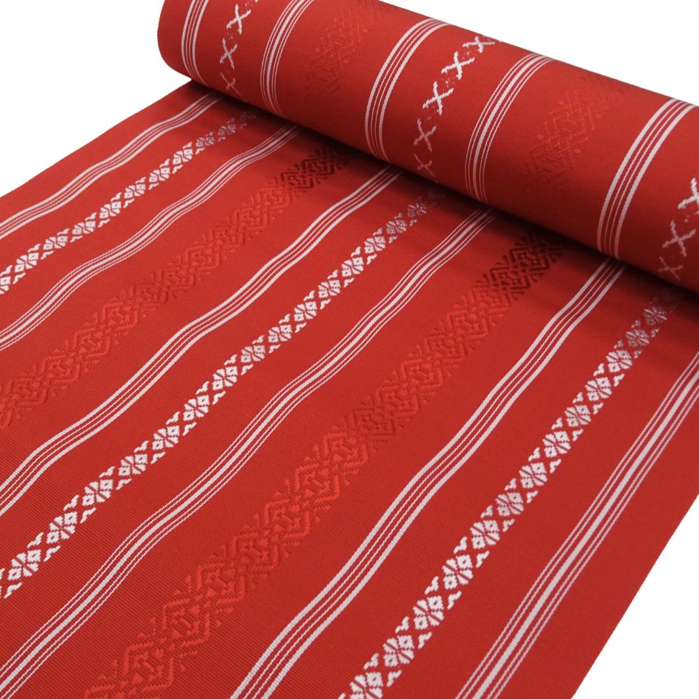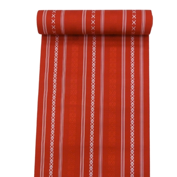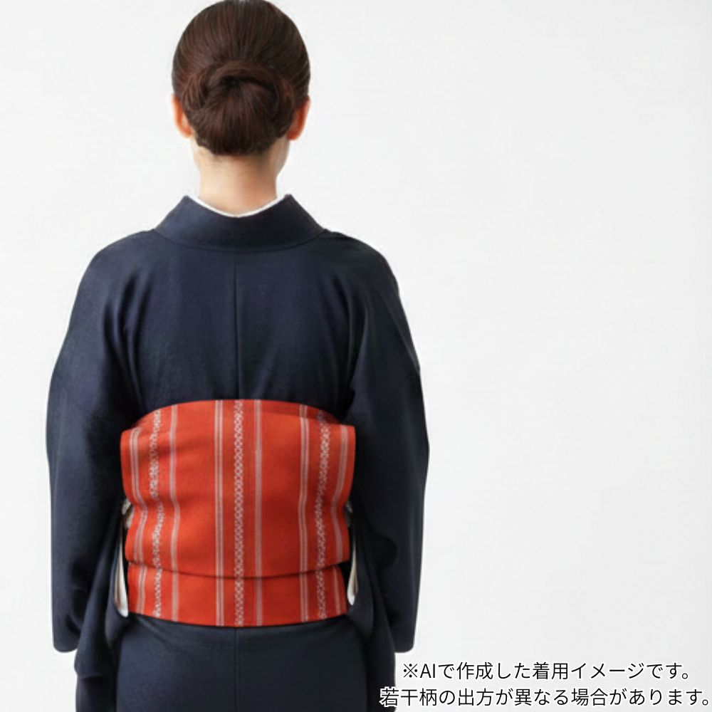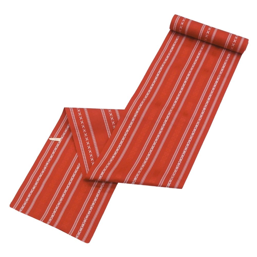 博多八寸帯反物 リユース 赤 朱色 本場筑前博多織 献上柄 独鈷 華皿 k12-013-7 (8050-00969) カジュアル 紬 小紋 街着 普段着