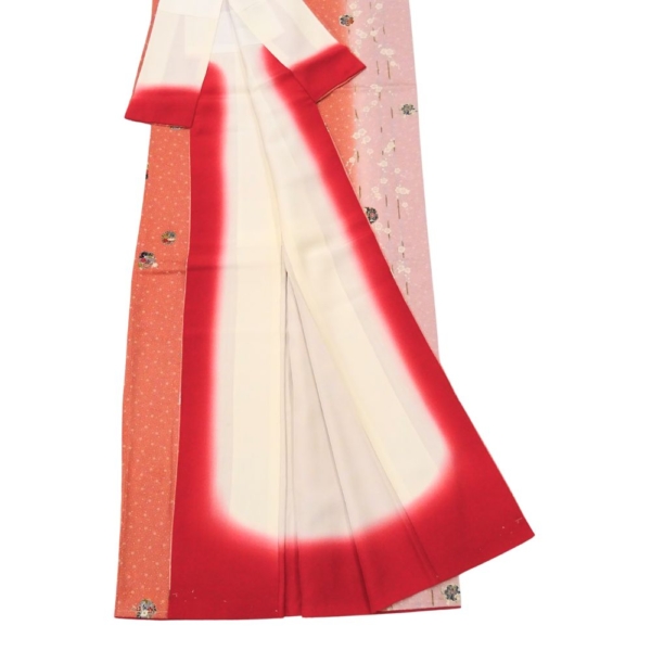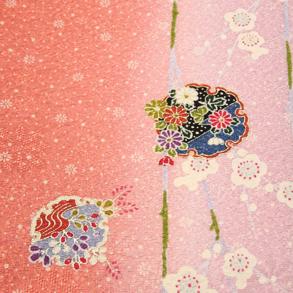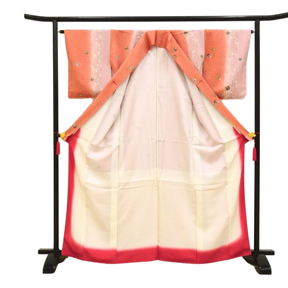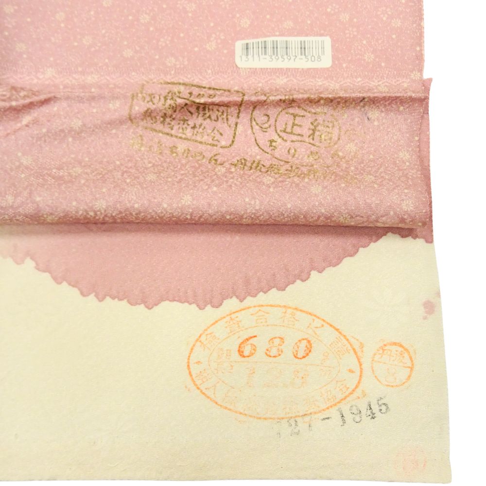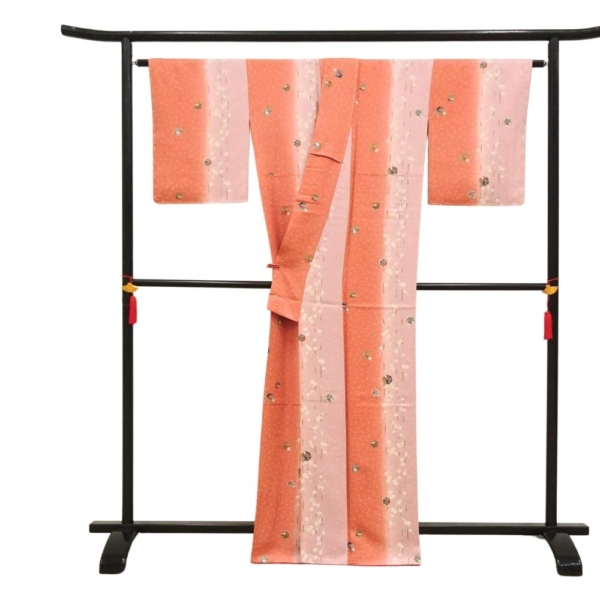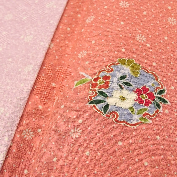 温かみのある朱桃色から、透明感のある薄ピンク色へと移ろう縦ぼかしが印象的な正絹の小紋です。