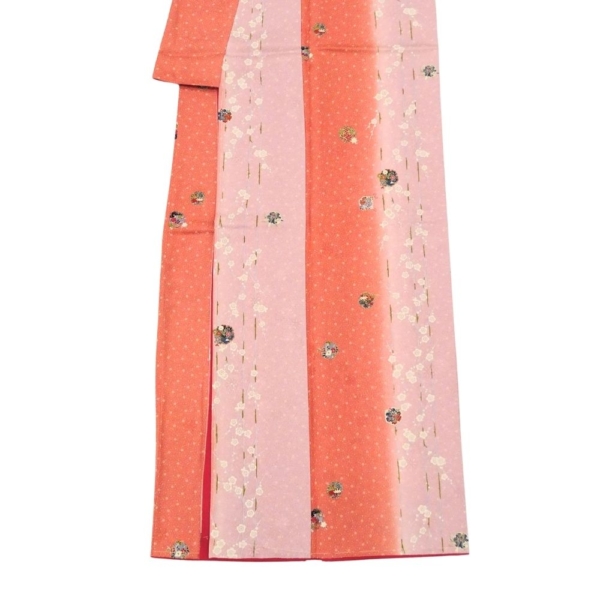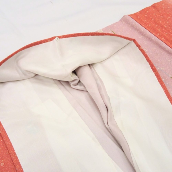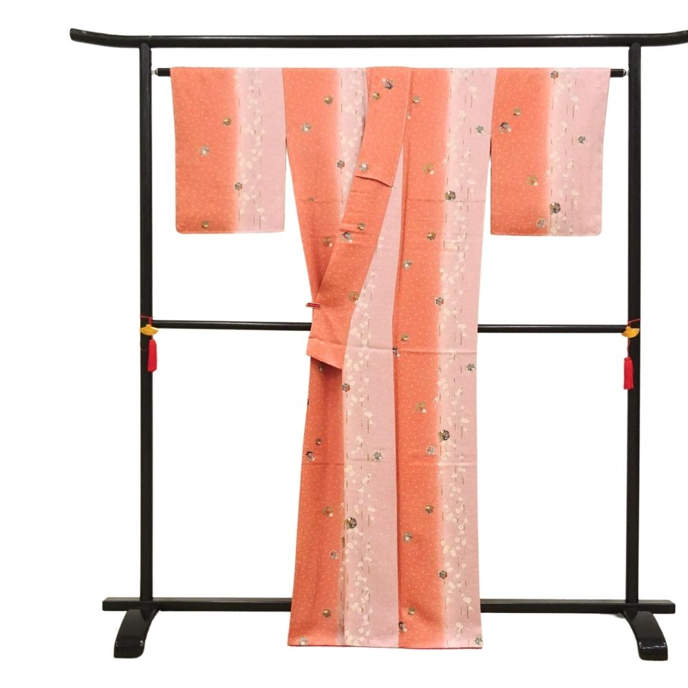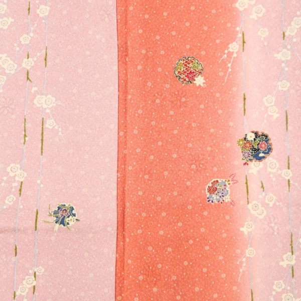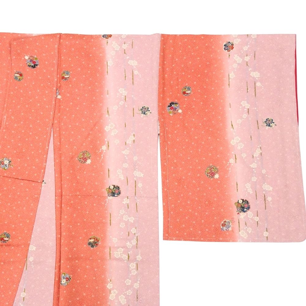 小紋 正絹 リユース 中古 朱桃×薄ピンク 雪輪に四季花 梅 縦ぼかし k12-017-1 (8050-00974) 華やか 上品 カジュアル