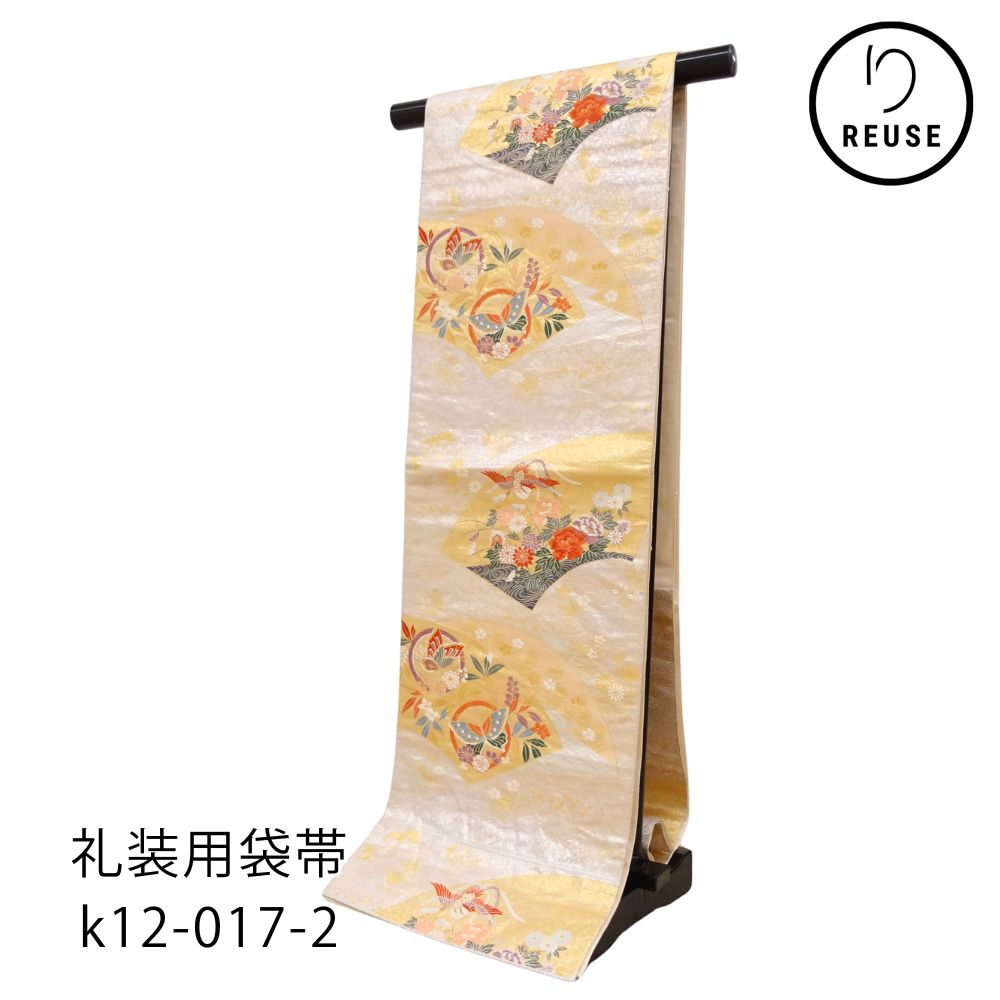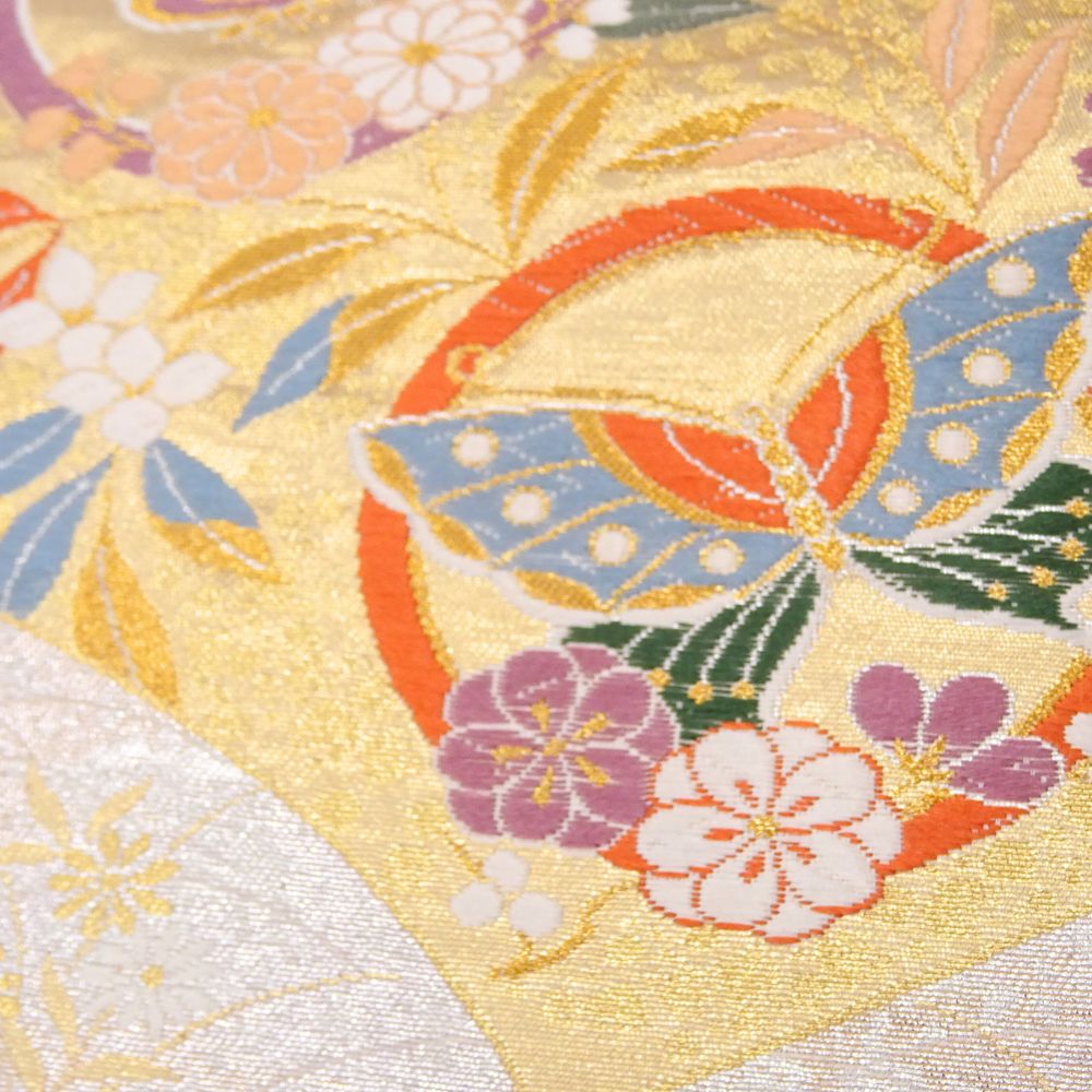 礼装用袋帯 正絹 リユース 西陣織 正絹 金地 扇面に鳳凰・四季花文様 k12-017-2 六通柄 振袖 留袖 成人式 結婚式