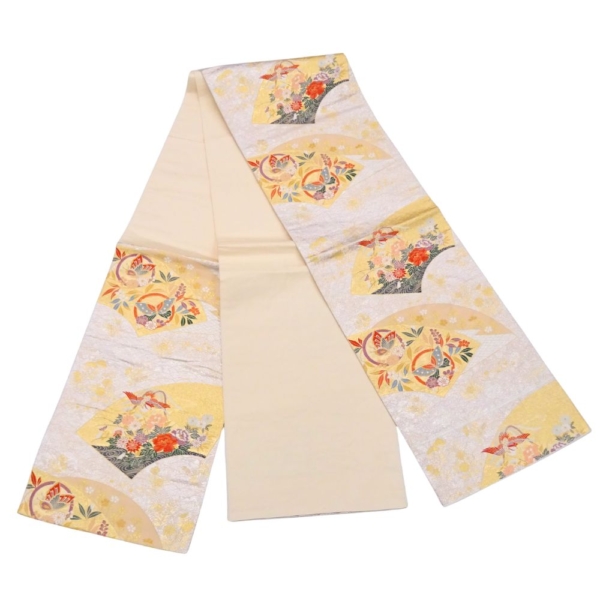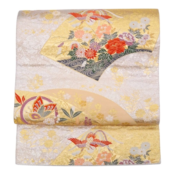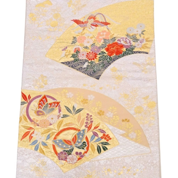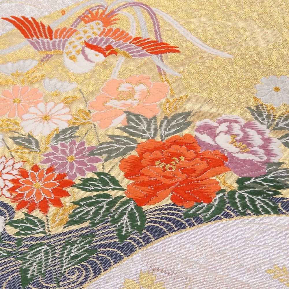 上品なゴールドの地色に、吉祥文様の代表格である鳳凰や華紋、そして扇面が緻密に織り上げられています。