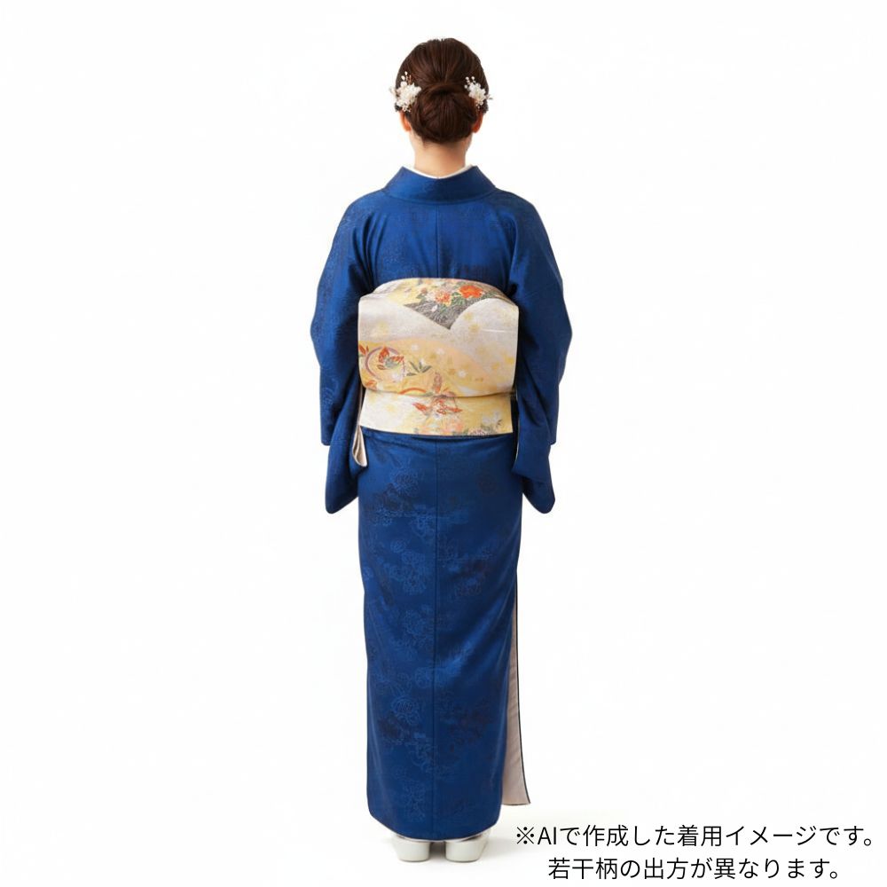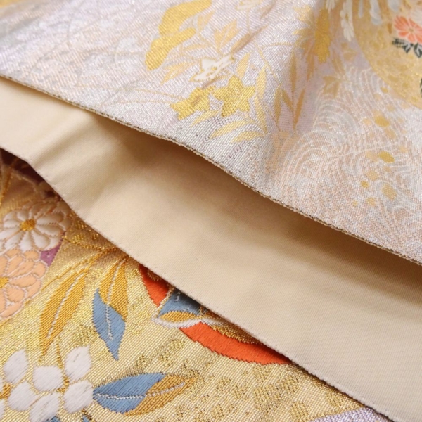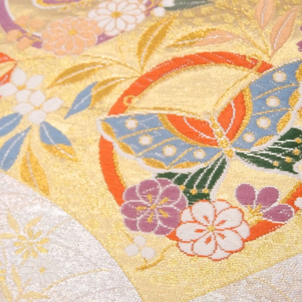 落ち着きのある金地をベースに、淡いピンク、オレンジ、グリーン、ブルーの差し色が絶妙なバランスで施されており、どんな色の着物にも合わせやすい配色です。